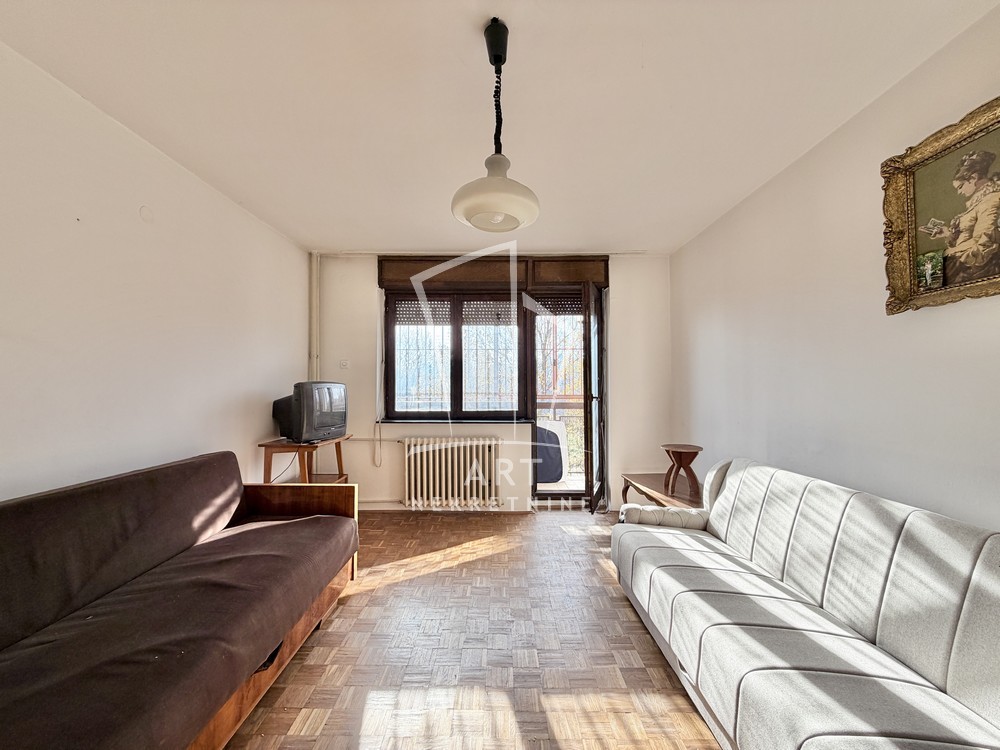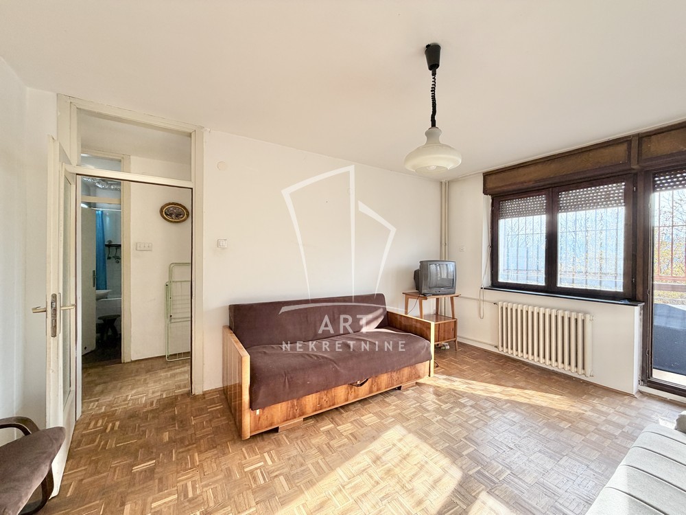 Na prodaju funkcionalan jednosoban stan na Petlovom brdu, smešten na visokom prizemlju uredne zgrade od bele fasadne cigle.