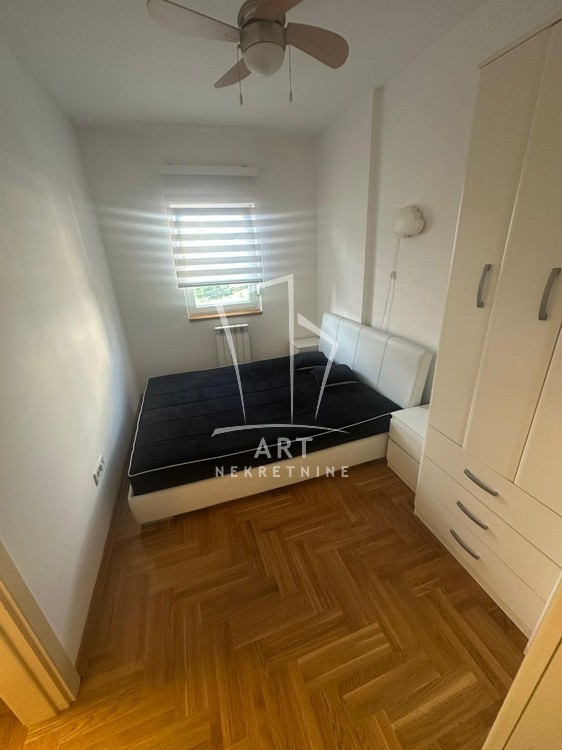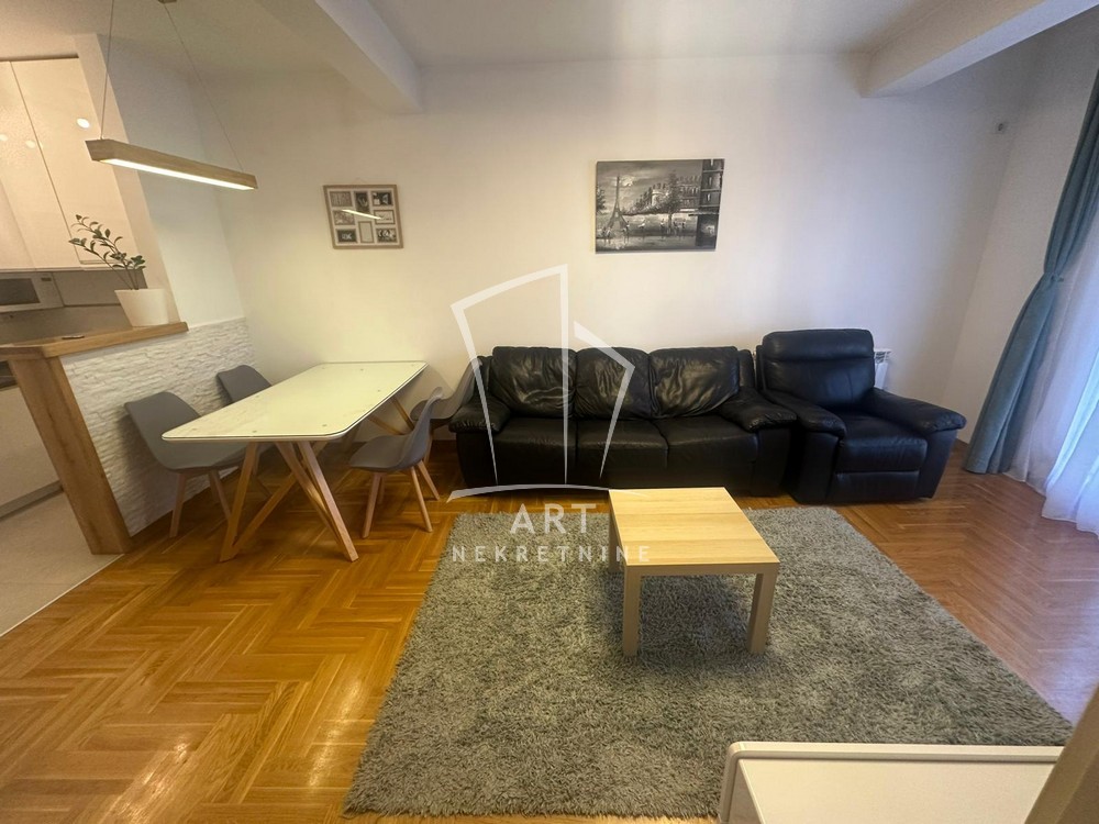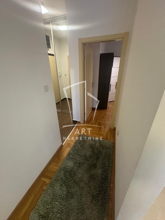 Stan se nalazi u mirnoj ulici u blizini gradske bolnice i ?eram pijace. Stan je na 1. spratu od ukupno 6 spratova. Kompletno je namešten. Sastoji se od hodnika sa velikim plakarom, dnevnog boravka sa trpezarijom, kompletno opremljenom kuhinjom, spavaćom sobom i još jednom manjom sobom koja može biti radna ili dečija.