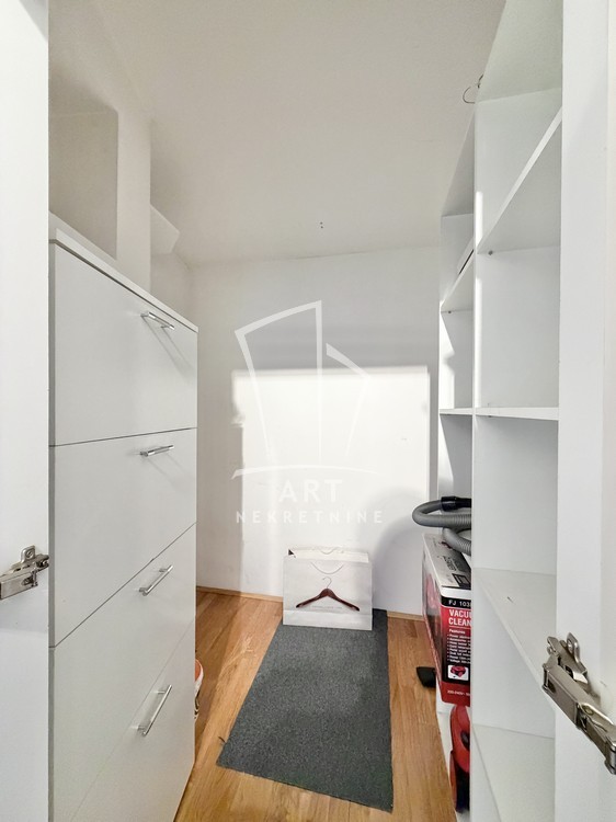 Ulazni hodnik sa skrivenim walk-in garderoberom, veliki open space koji obuhvata kuhinju i trpezariju sa izlaskom na veliku terasu spojen sa prostranom dnevnom sobom koja izlazi na manju ,zastakljenu terasu,veća i manja spavaća soba,kupatilo sa đakuzijem.