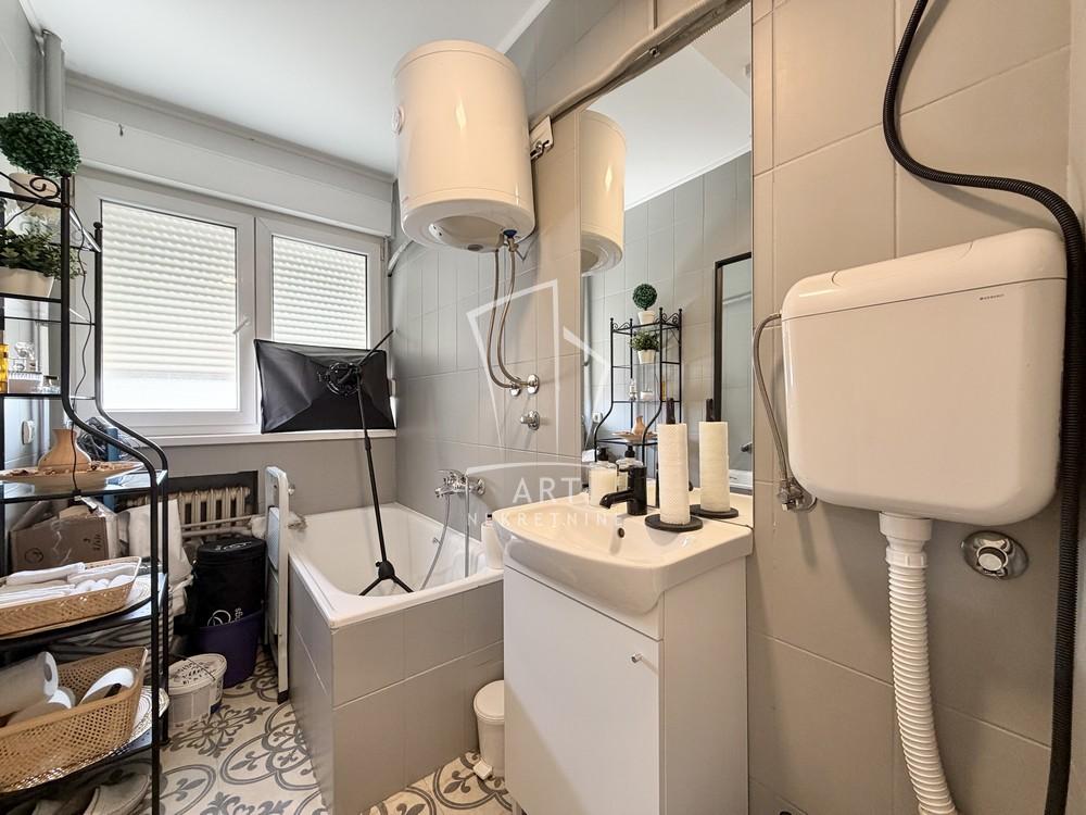 Stan je renoviran i sastoji se od dugog hodnika iz koga se ulazi u prostranu kuhinju, kupatilo i veliku sobu (izvorno dve sobe koje su spojene u jednu).