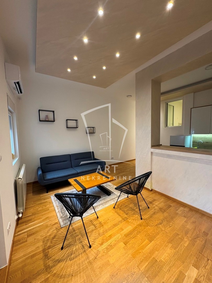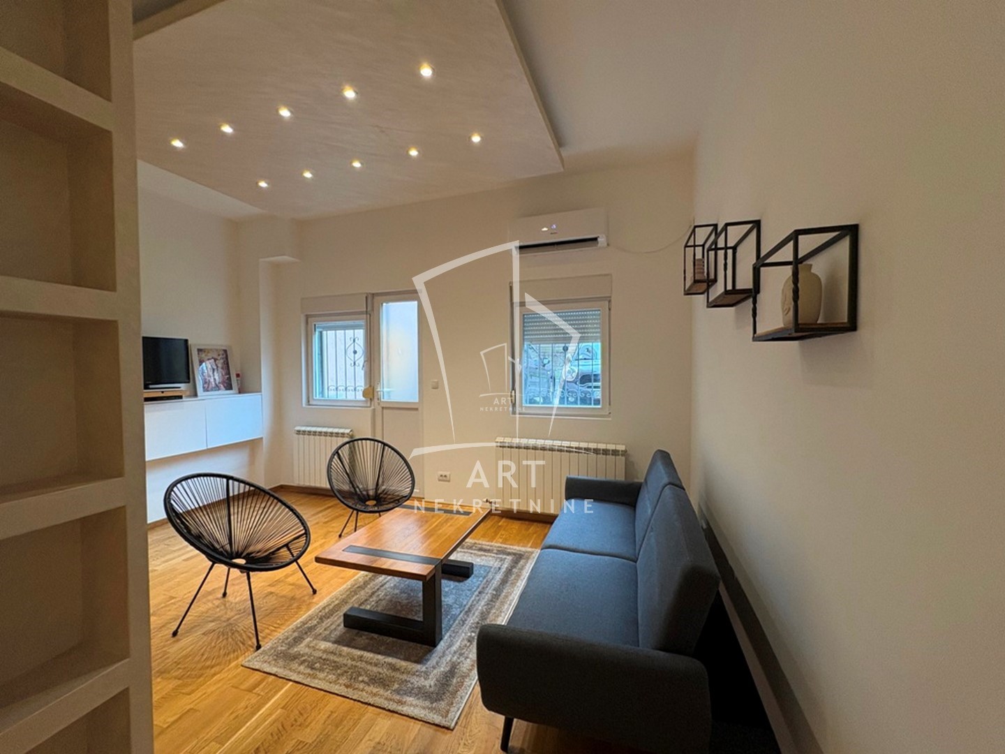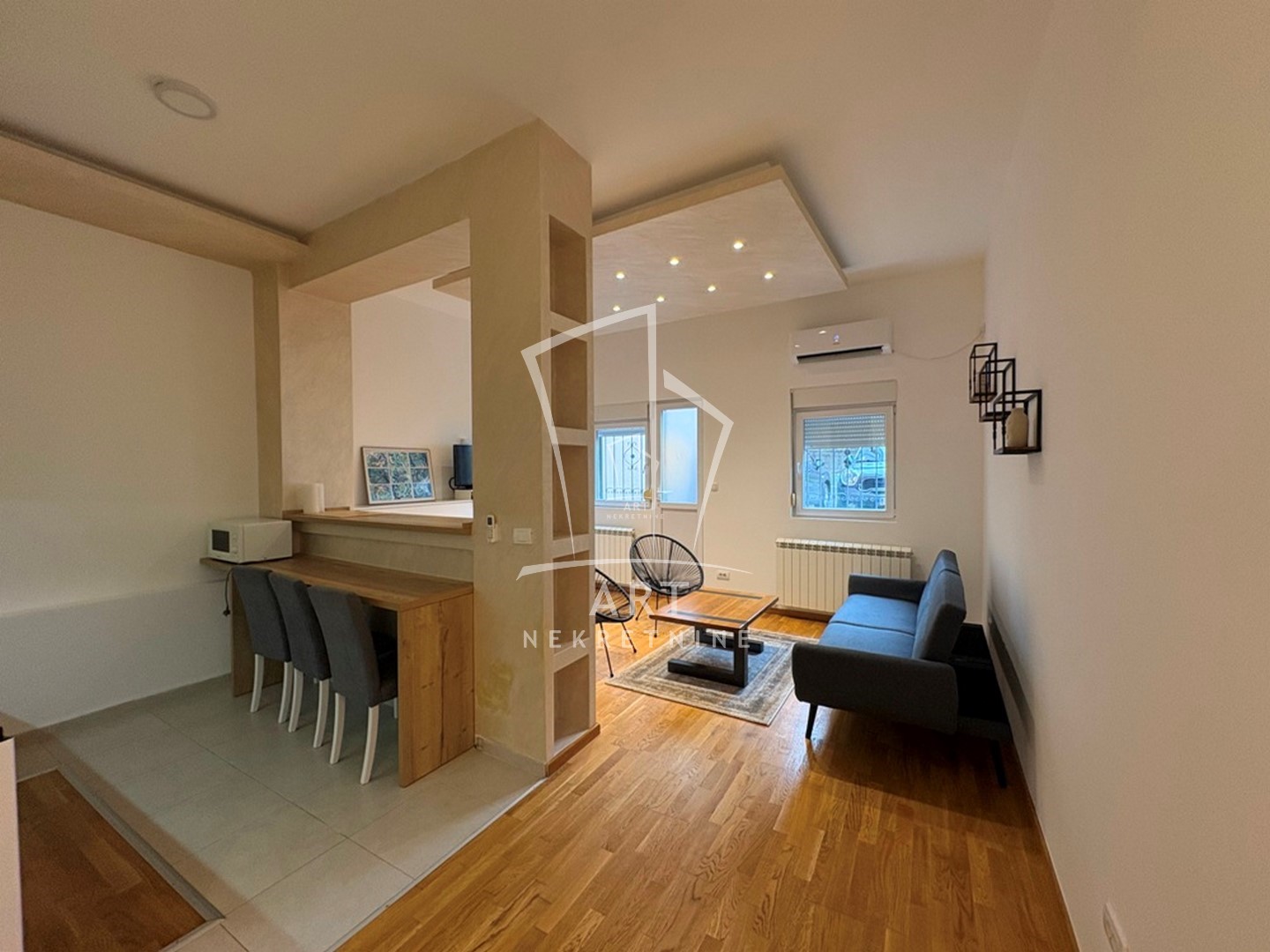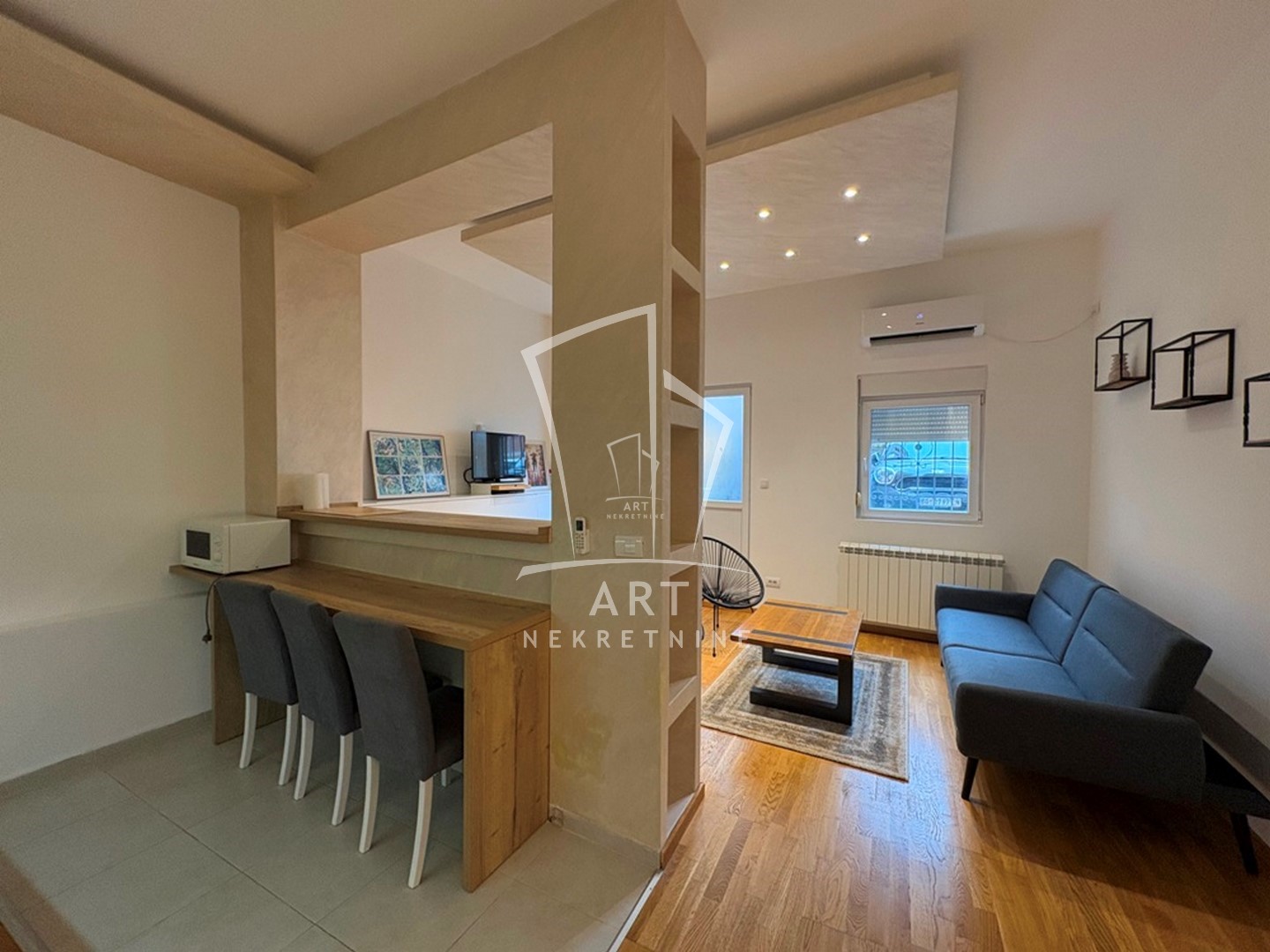 Opremljen je novim nameštajem, a dodatni komfor pružaju visoki plafoni od 3.20 m, etažno grejanje, inverter klima uređaj, kao i niski mesečni troškovi. Dostupno je parking mesto uz doplatu od 50€.