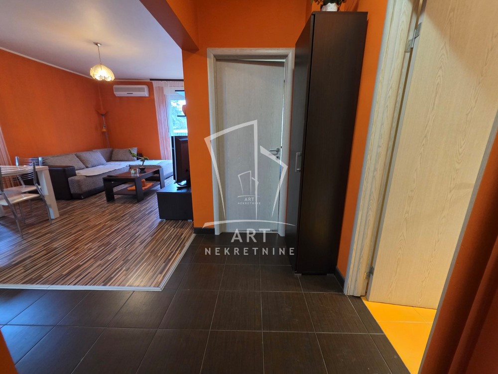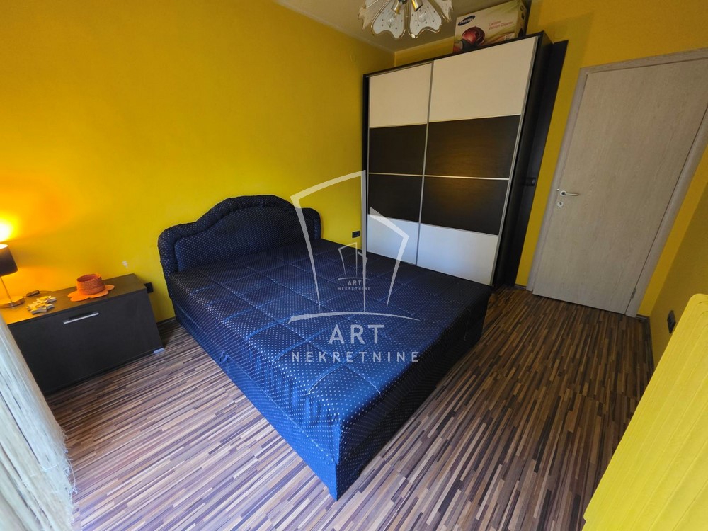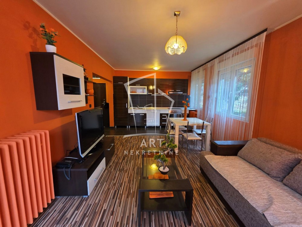 Poseduje: ulazni hodnik, dve odvojene prostorije, kompletno opremljenu kuhinju sa svim potrebnim aparatima (frižider, zamrzivač, sud? mašina). Stan raspolaže sa dva dodatna prozora u obe sobe, što omogućava izuzetnu osvetljenost prostora.