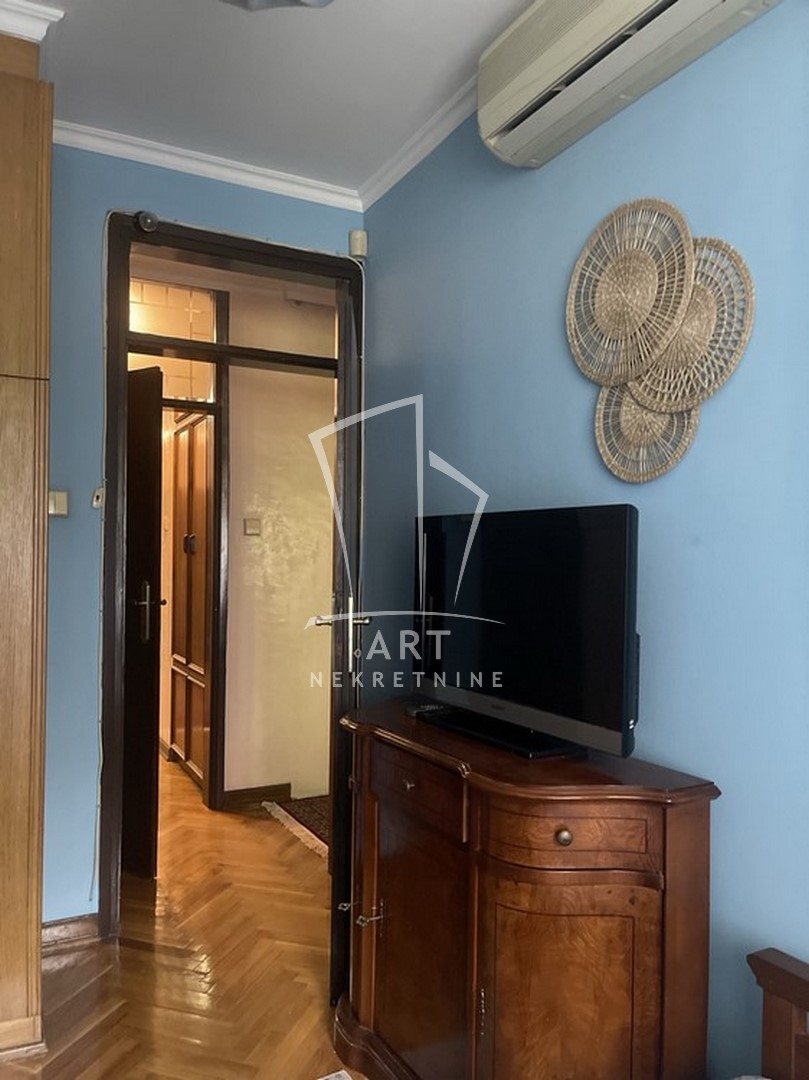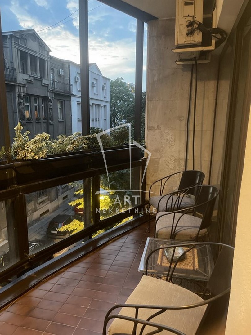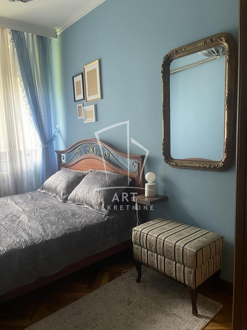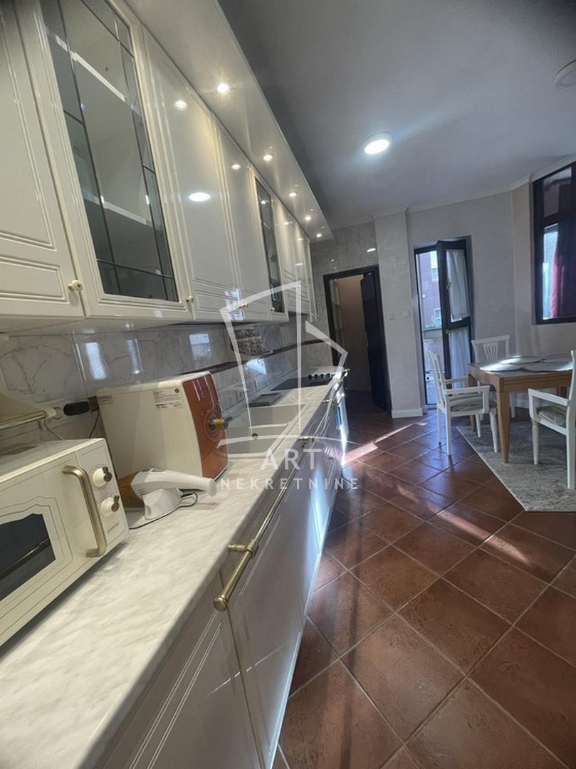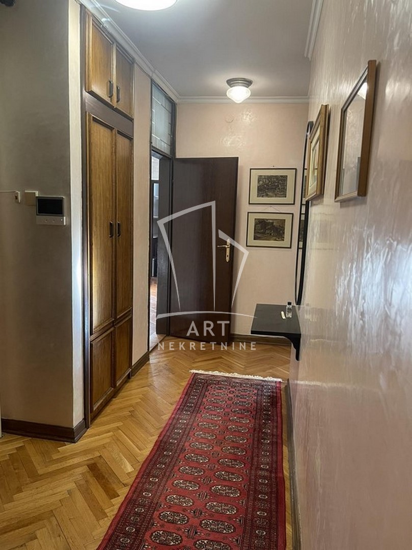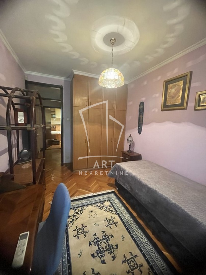 Odličan dvostrano orijentisan stan u blizini Zelenog venca. Sastoji se od tri spavaće sobe, velike dnevne sobe sa trpezarijom, kuhinje sa trpezarijom, dva kupatila, malog toaleta, vešeraja, ostave, walk in garderobera i dve terase. Prednost ovog stana je centralni hodnik iz kojeg se ulazi u sve prostorije. Iz dve spavaće sobe postoji izlaz na zastakljenu terasu sa jedne strane stana, a sa druge strane na terasu se izlazi iz dnevne sobe i kuhinje. Kompletno opremljen stvarima za svakodnevni život. U blizni su supermarketi , pijaca Zeleni venac, linije gradskog prevoza. Zgrada je održavana i čista. Dozvoljeni su manji kućni ljubimci. Mogućnost rentiranja parking mesta prekoputa zgrade.