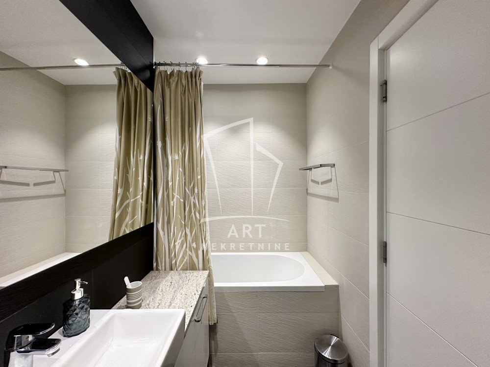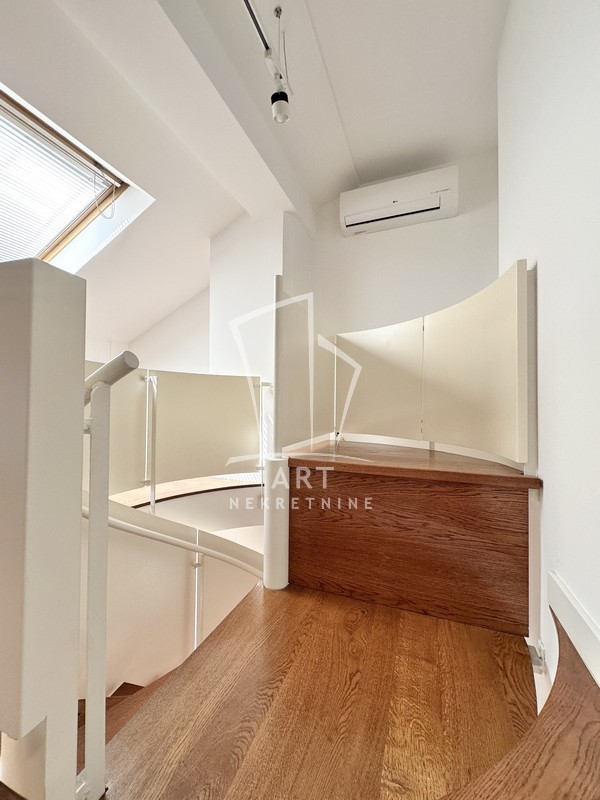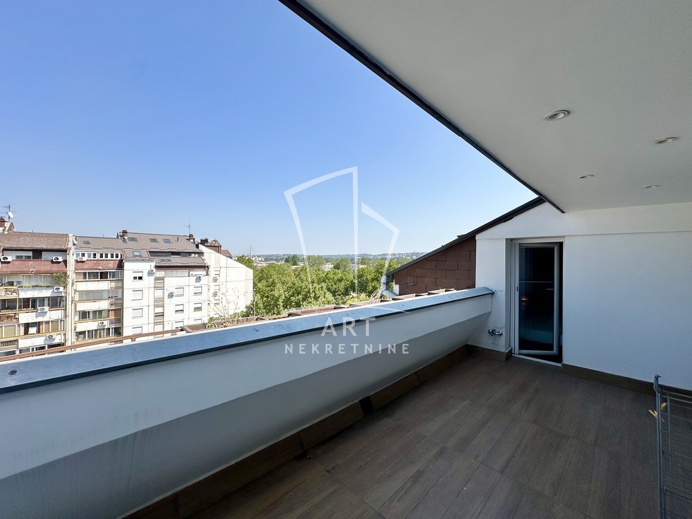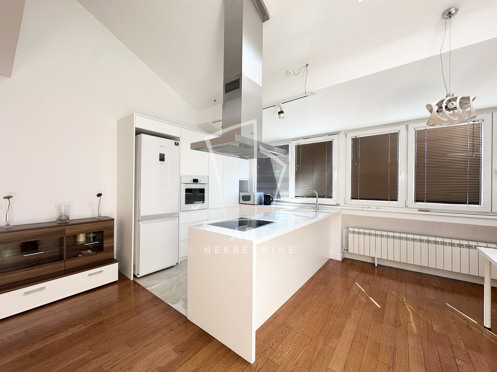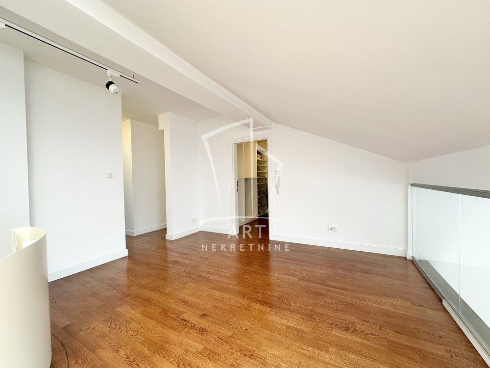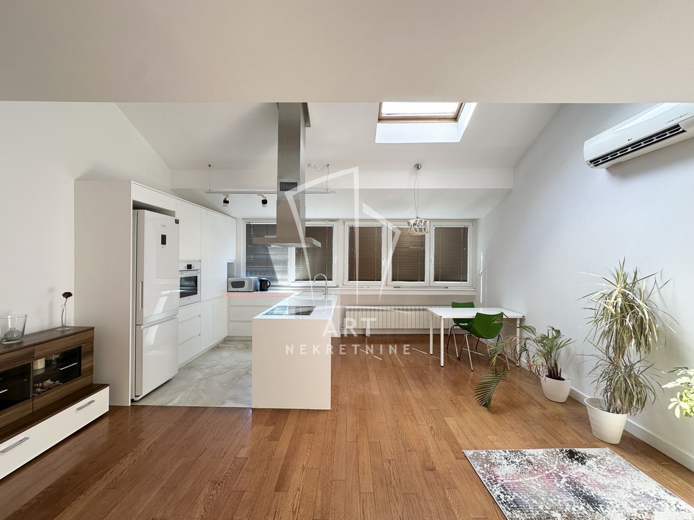 Renoviran atraktivan dupleks na najboljoj lokaciji na Novom Beogradu, pored Savskog šetališta. Okružen zelenilom, uređenim parkovima, u neposrednoj blizini TC Piramida, pijace, brojnih škola I vrtića, ovaj stan je odična prilika za veću porodicu. Stan se sastoji od hodnika iz kog se može ući u gostinski toalet, od veoma velike dnevne sobe sa fantastičnim pogledom i kuhinje.