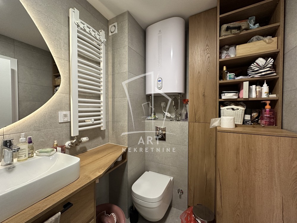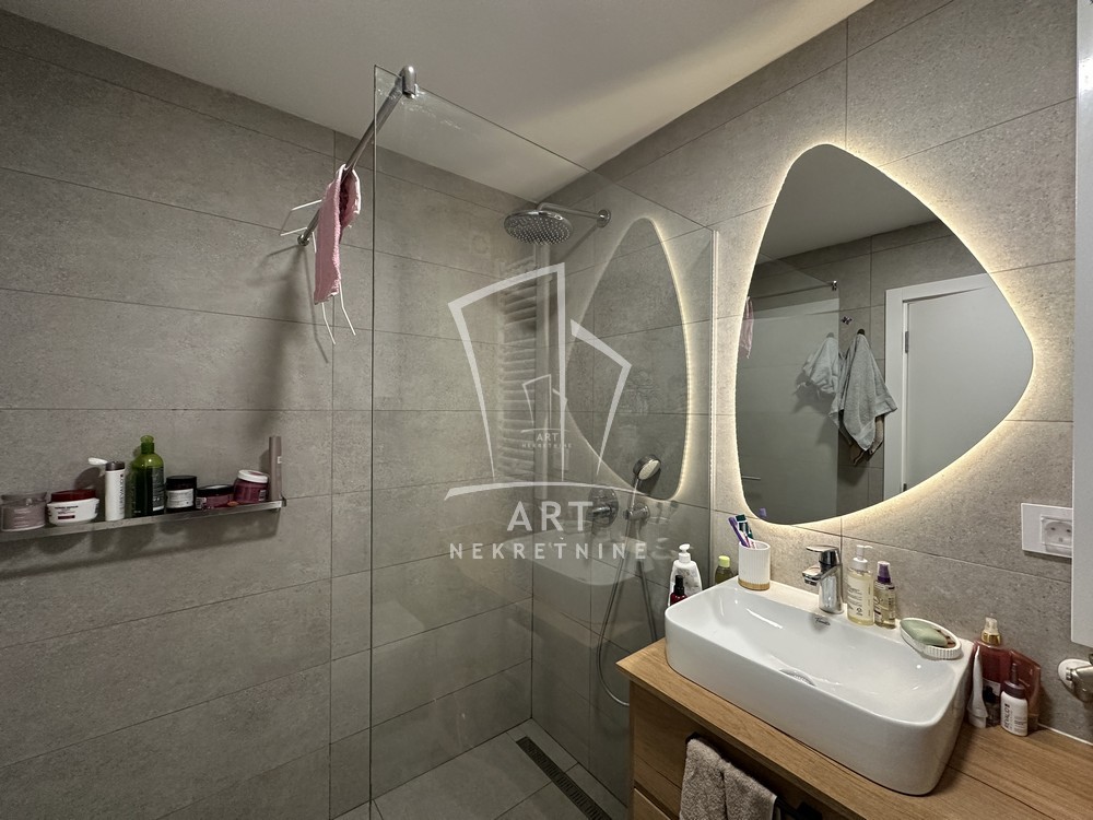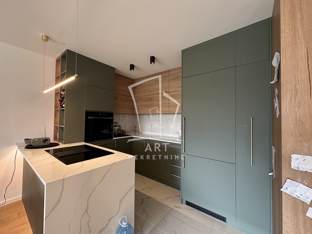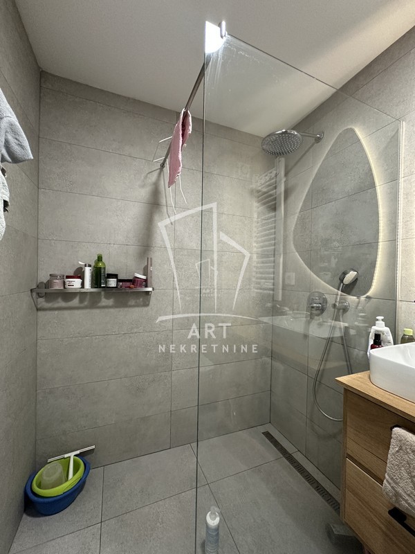 Prostorije: hodnik, prostran dnevni boravak sa trpezarijom i izlazom na terasu, kuhinja po meri sa ugradnim aparatima, tri spavaće sobe od kojih je jedna master sa sopstvenim kupatilom i još jedno prostrano kupatilo.