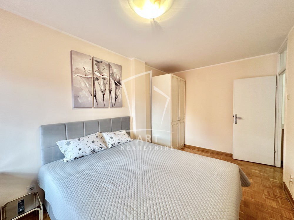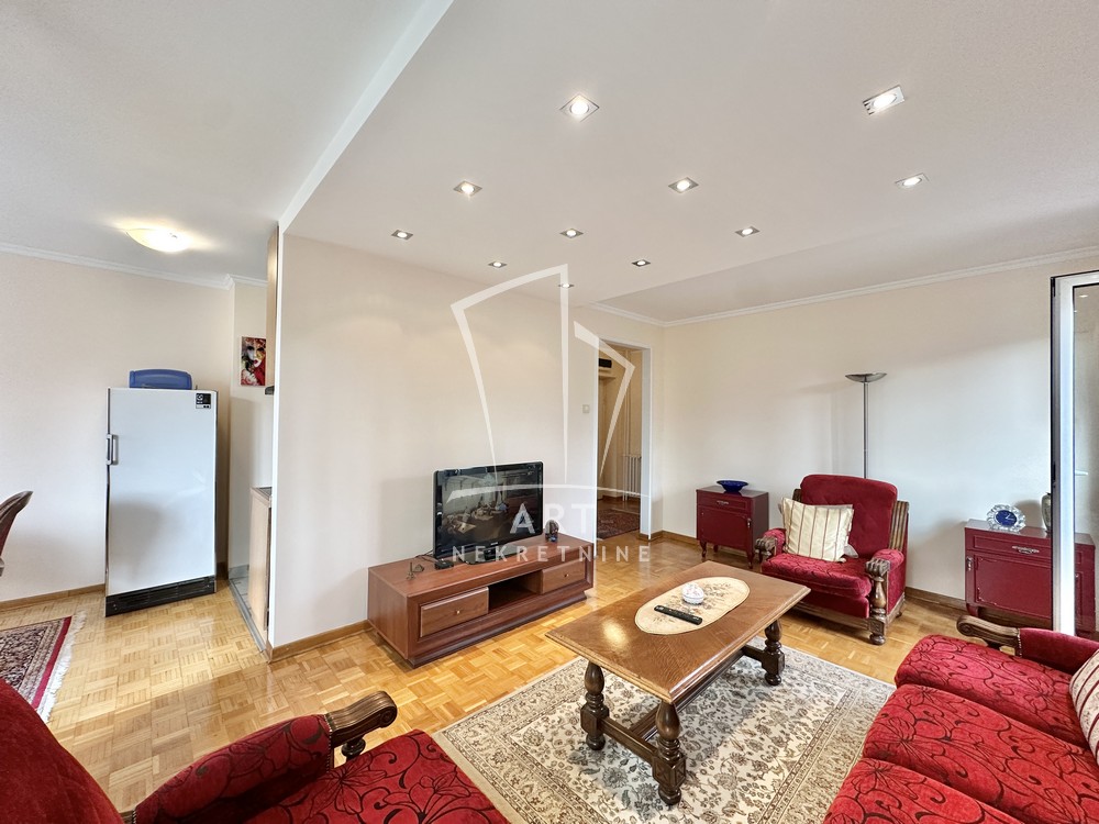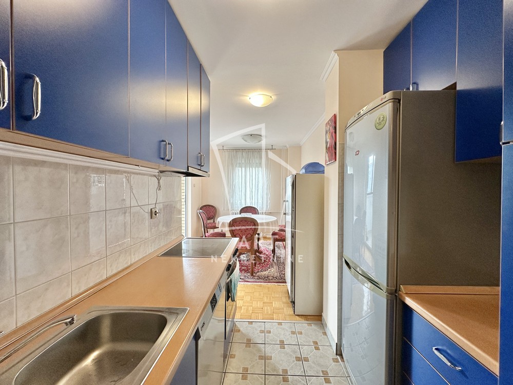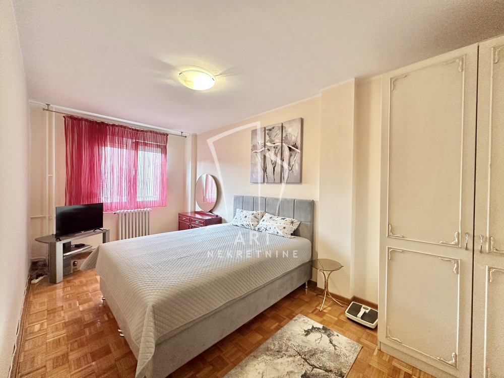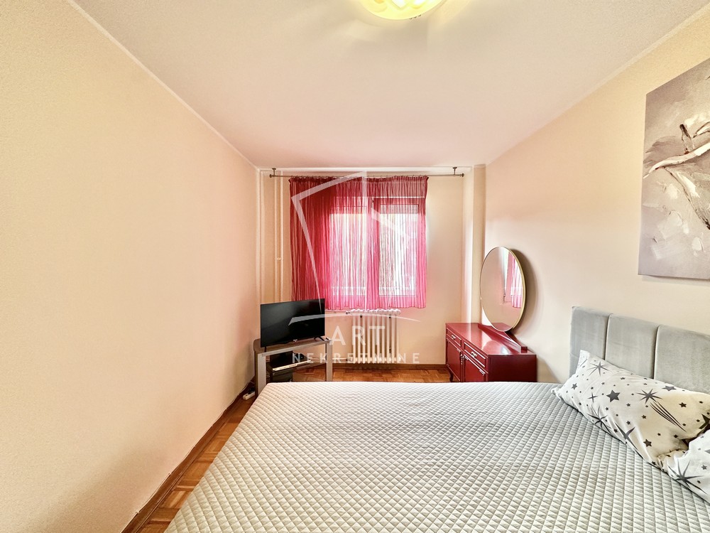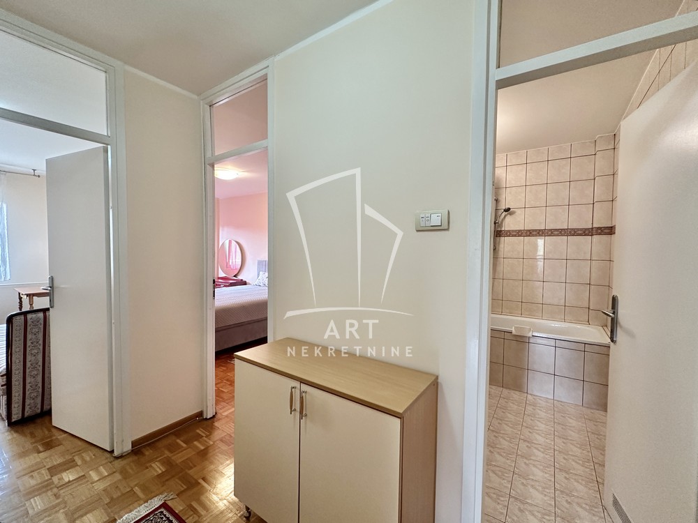 Hodnik, komforna dnevna soba, kuhinja, trpezarija, dve lepe spavaće sobe, dva kupatila, dve lođe, sunčan i svetao. Odmah useljiv.