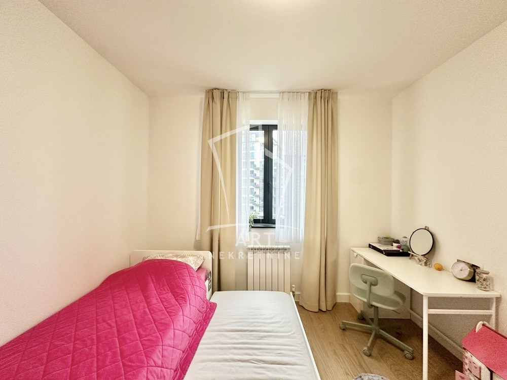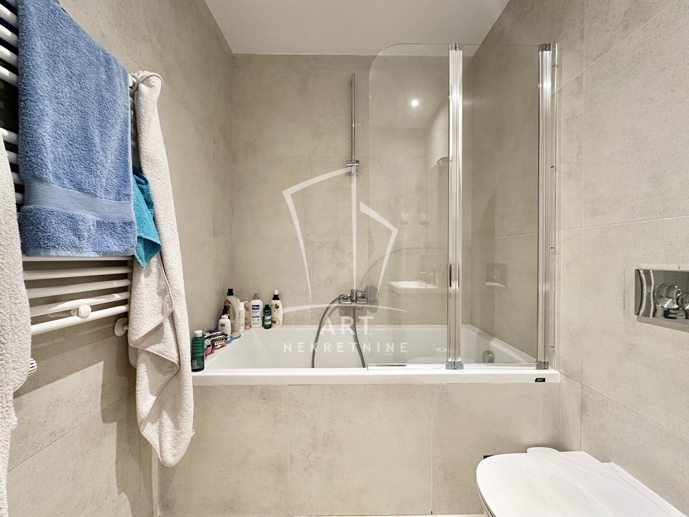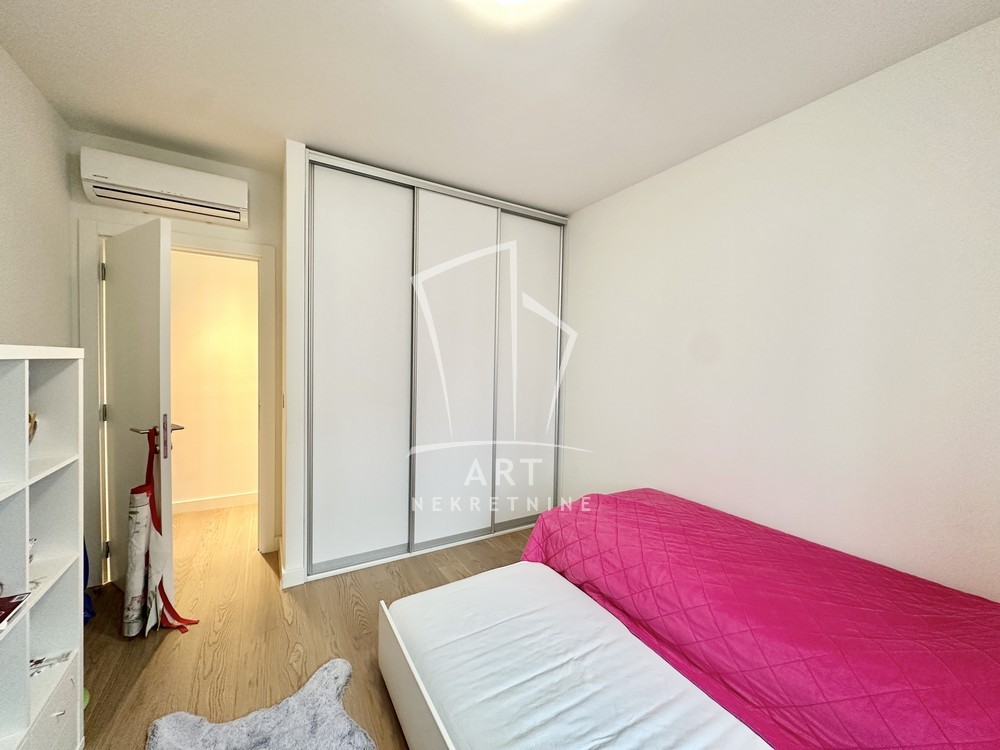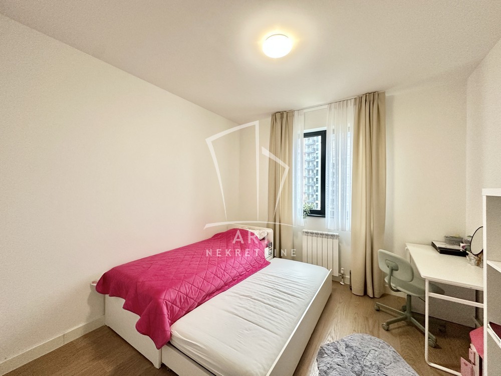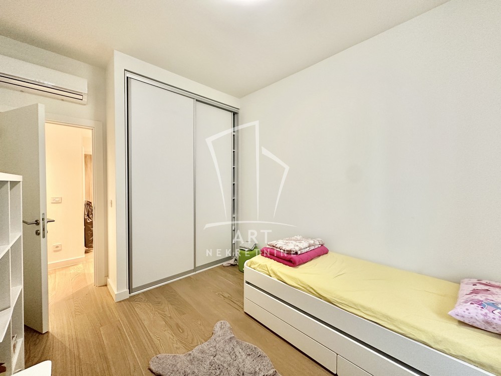 Moderan i prostran stan u Bw od 110 m2 na odličnoj lokaciji, sastoji se iz 3 spavaće sobe sa ugradnim plakarima, dva kupatila i jedan gostinski toalet.