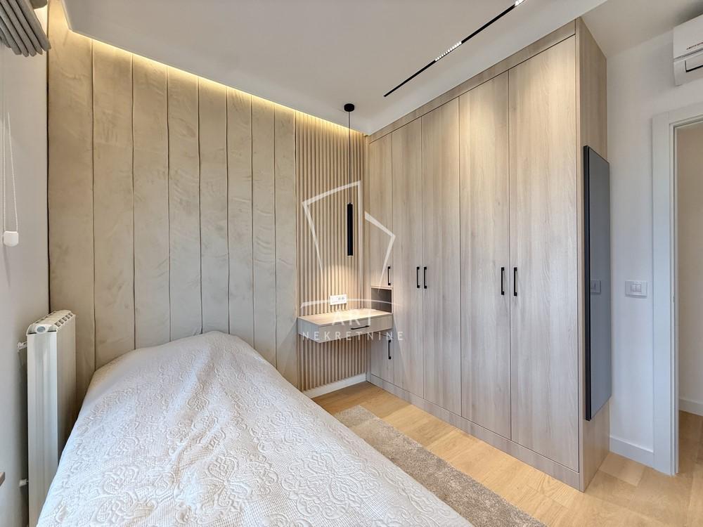 Od prostorija poseduje dnevni boravak sa kuhinjsko-trpezarijskim delom, dve spavaće sobe, dva kupatila, vešernicu, terasu.,.Oba kreveta i u jednoj i u drugoj spavaćoj sobi mogu da se izvlače.