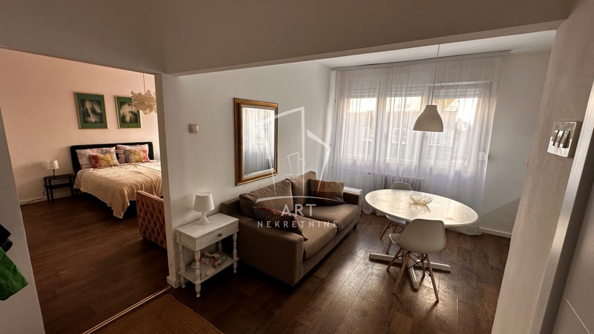 Stan se sastoji od dnevne sobe sa kuhinjom i trpezarijom, odvojene spavaće sobe i kupatila . Kompletno je namešten i opremljen svim potrebnim uređajima (šporet, frižider, veš mašina, TV, klima uređaj).Grejanje je centralno, što omogućava komfor tokom cele grejne sezone.