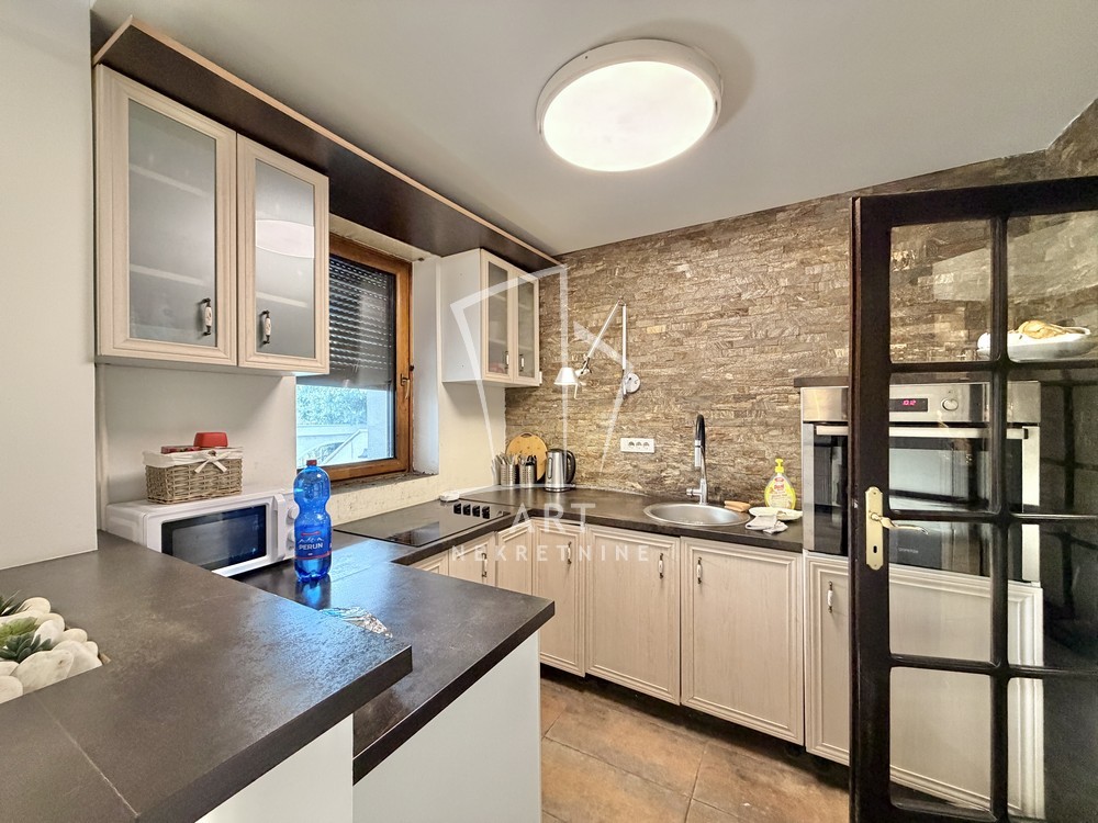 Na visokom prizemlju nalazi se prostran dnevni boravak sa kuhinjom, trpezarijom i kaminom, sa izlazom na terasu od 28m, ispod koje je garaža iste kvadrature sa kanalom i priključcima za vodu i struju, kao i 2 parking mesta. Podno grejanje je u dnevnom boravku (centralno gradsko), dok su u ostatku kuće radijatori.