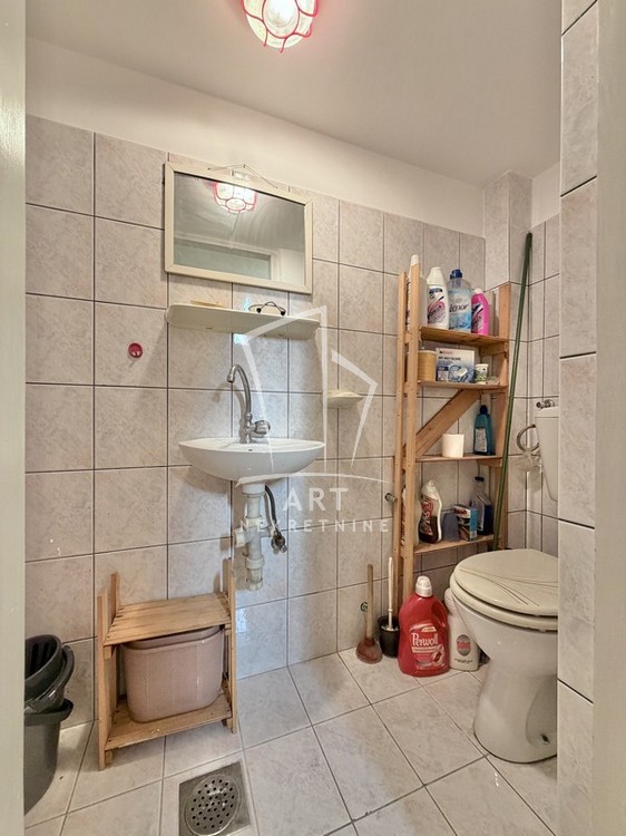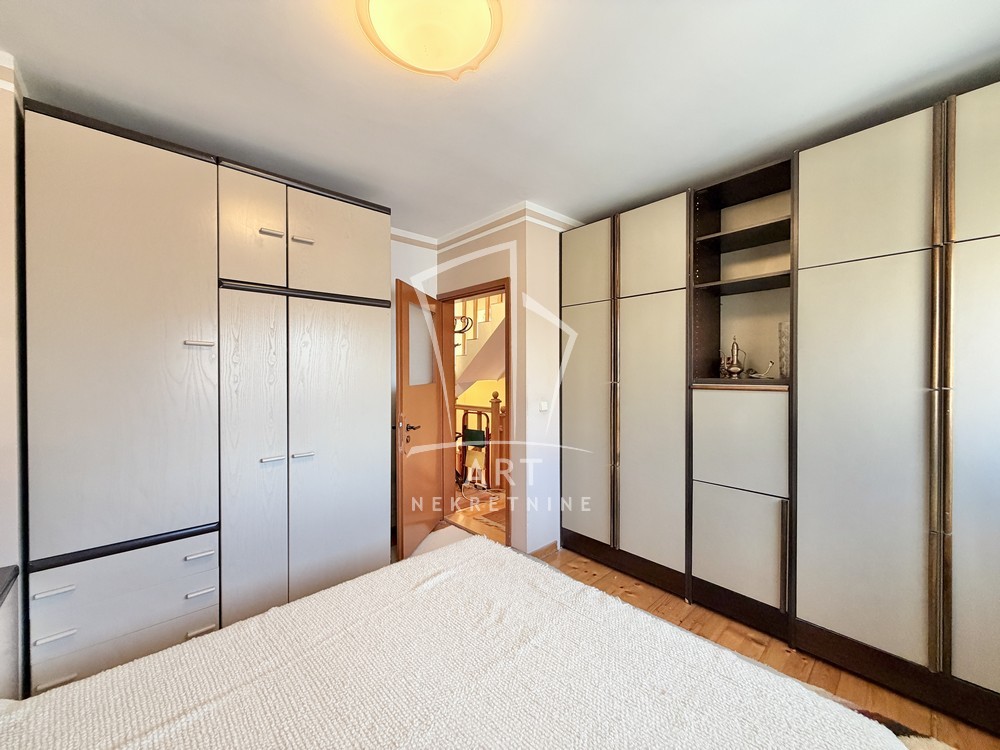 Trosoban stan je organizovan na više nivoa, na visokom prizemlju se nalazi dnevni boravak, kuhinja sa ostavom i kupatilo, na sledećem nivou su dve spavaće sobe i kupatilo. Kvalitetno drveno stepenište vodi ka potkrovlju. U suterenu stana se nalazi ostava sa toaletom.