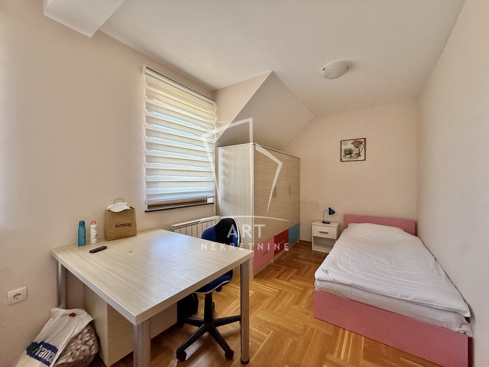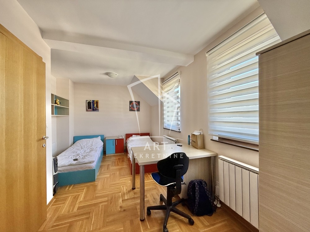 Na drugom nivou se nalaze dve spavaće sobe. Jedna prostranija, dečija, sa tri kreveta, radnim stolom, policama i garderoberom, a druga sa ugradnim plakarom, francuskim ležajem i natkasnom.