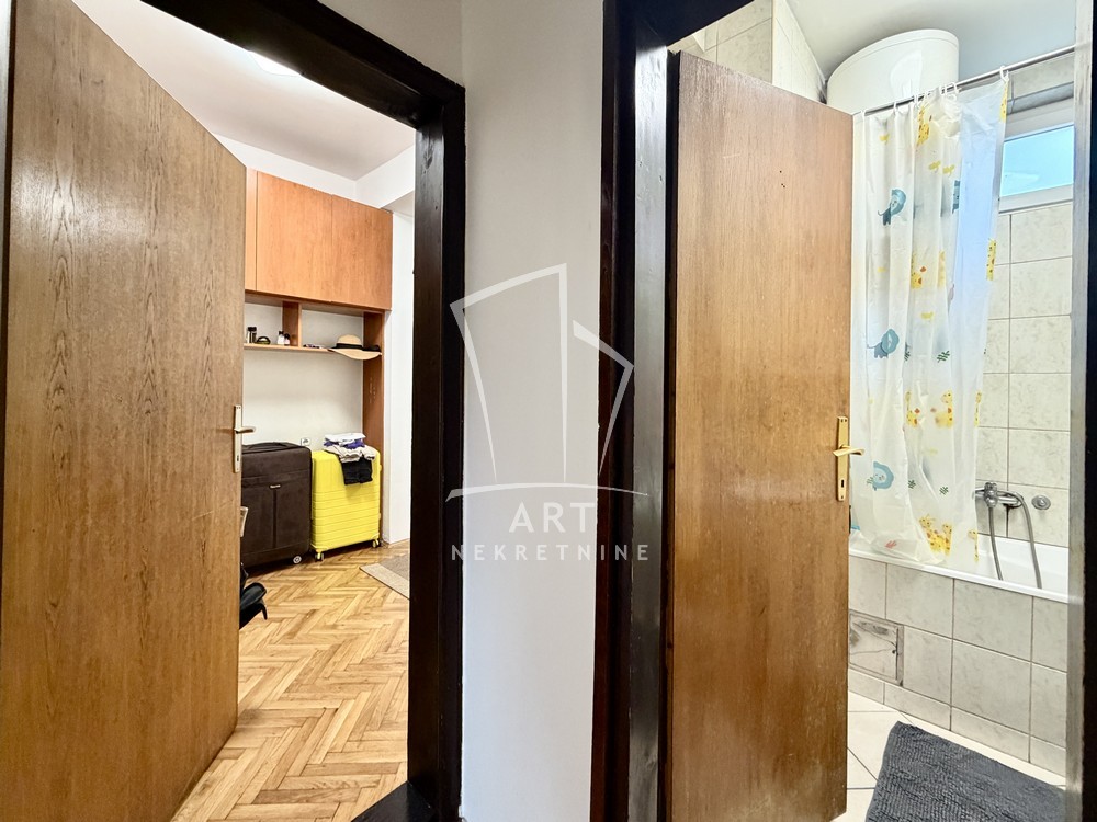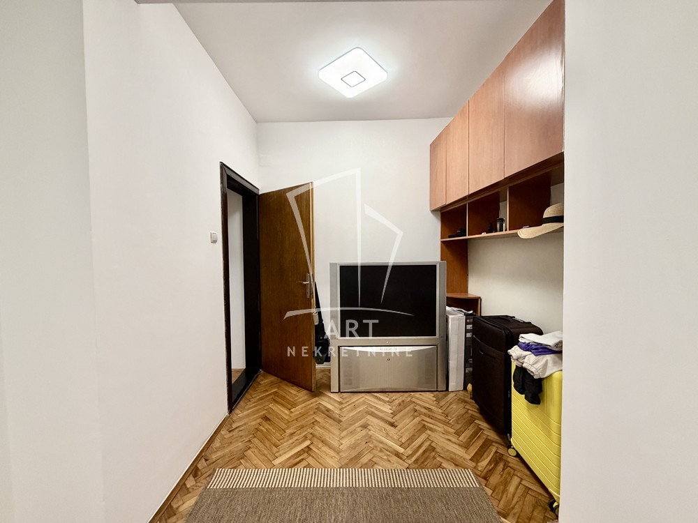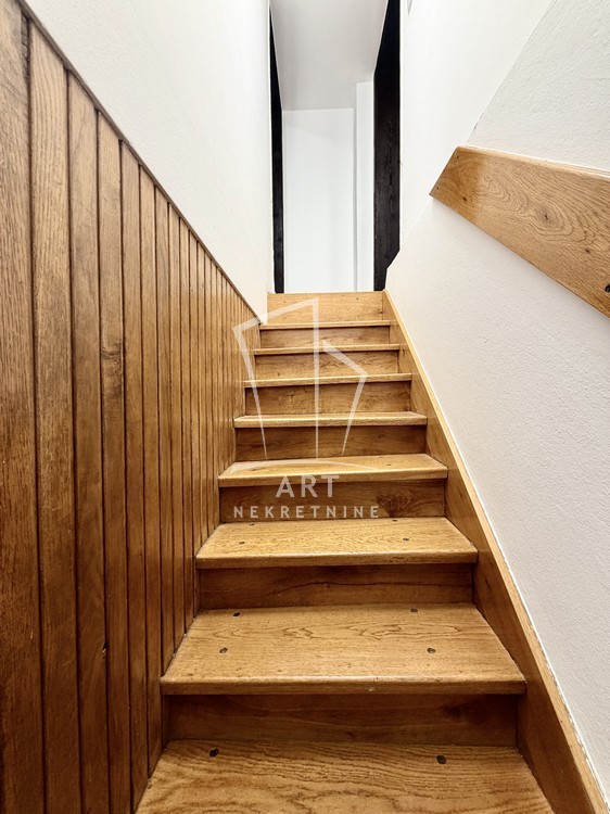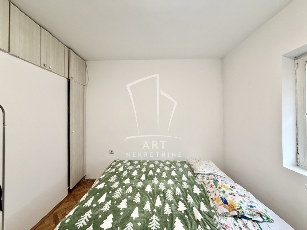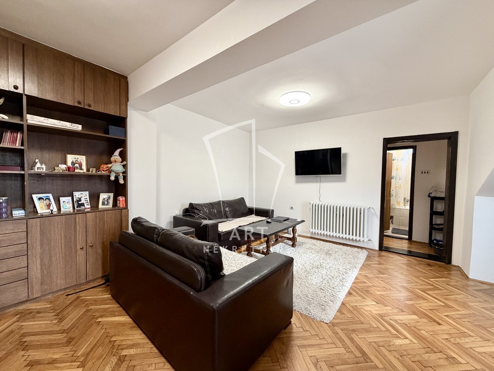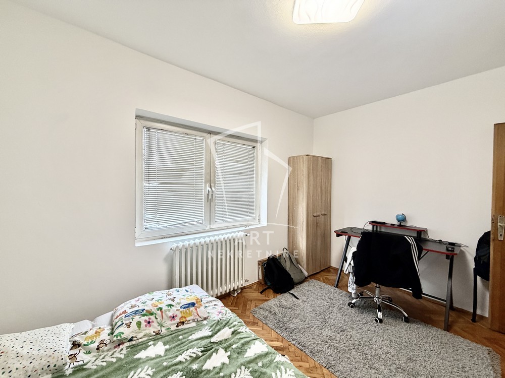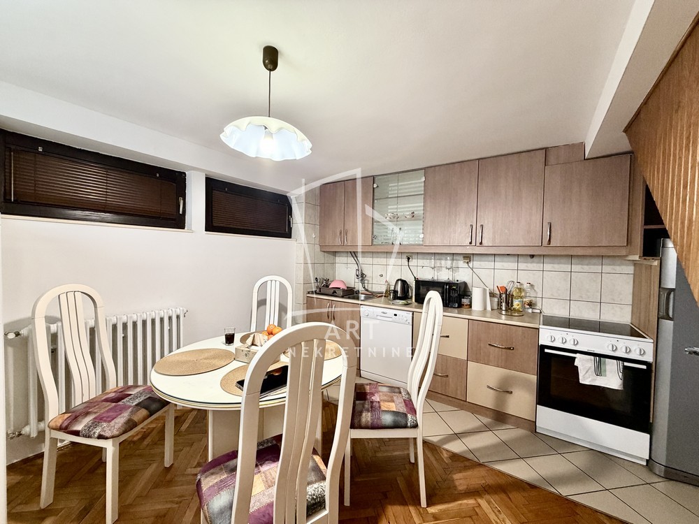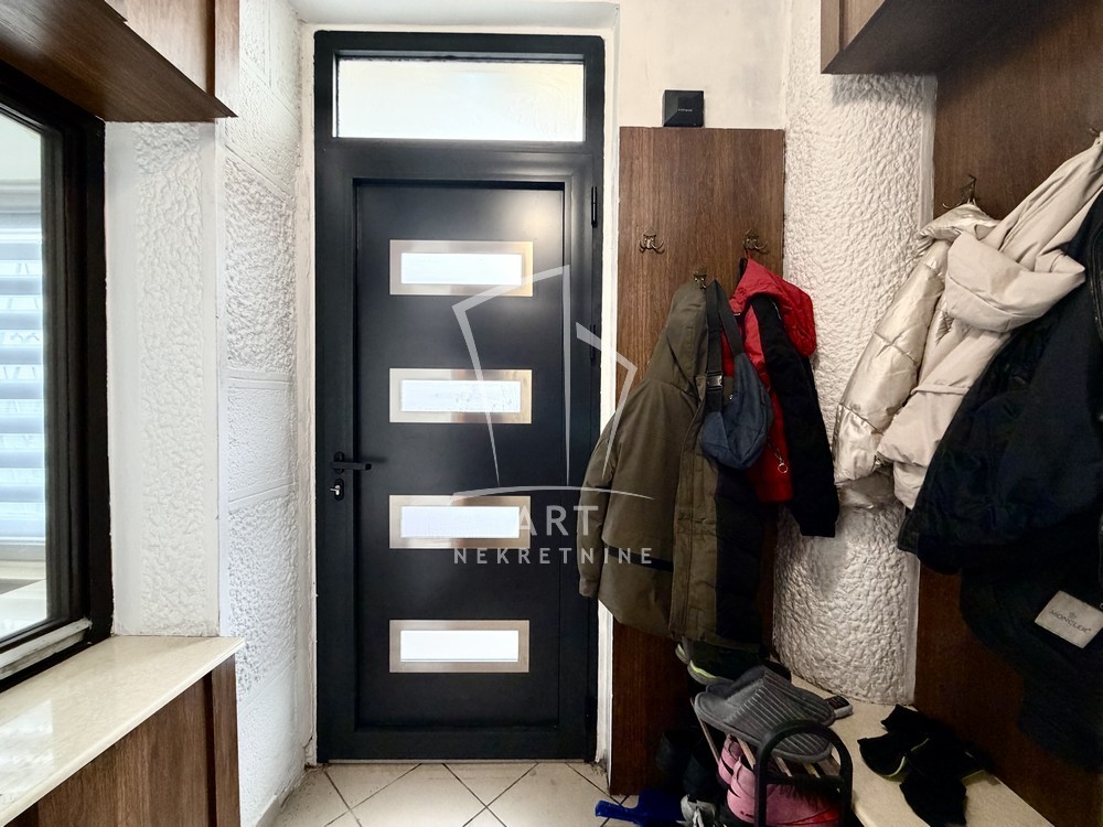 Dvoetažni stan u kući. Zaseban ulaz. Stan je na visokom prizemlju. Na gornjem nivou se nalazi ulazni hodnik, dnevna soba, kupatilo i dve spavaće sobe. Na donjem nivou je kuhinja sa trpezarijom. Stan je adaptibilan u četvorosoban. Ima garažu, na kojoj se može napraviti terasa.