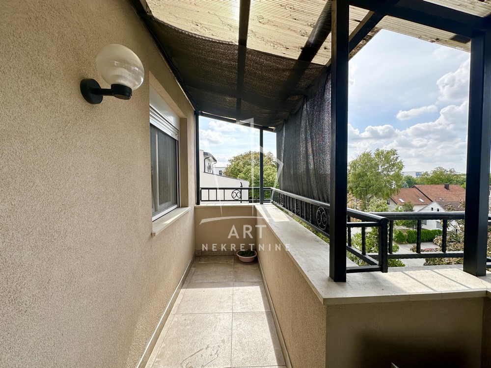 Prostor se sastoji iz ulaznog hodnika, velikog dnevnog boravka sa kuhinjom i trpezarijom iz kog se izlazi na veliku terasu, prostrane spavaće sobe, dečije sobe, sobe garderobera i kupatila sa protočnim bojlerom.