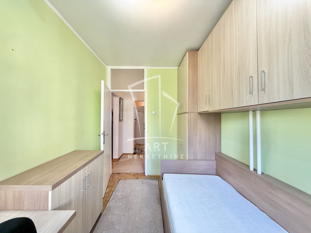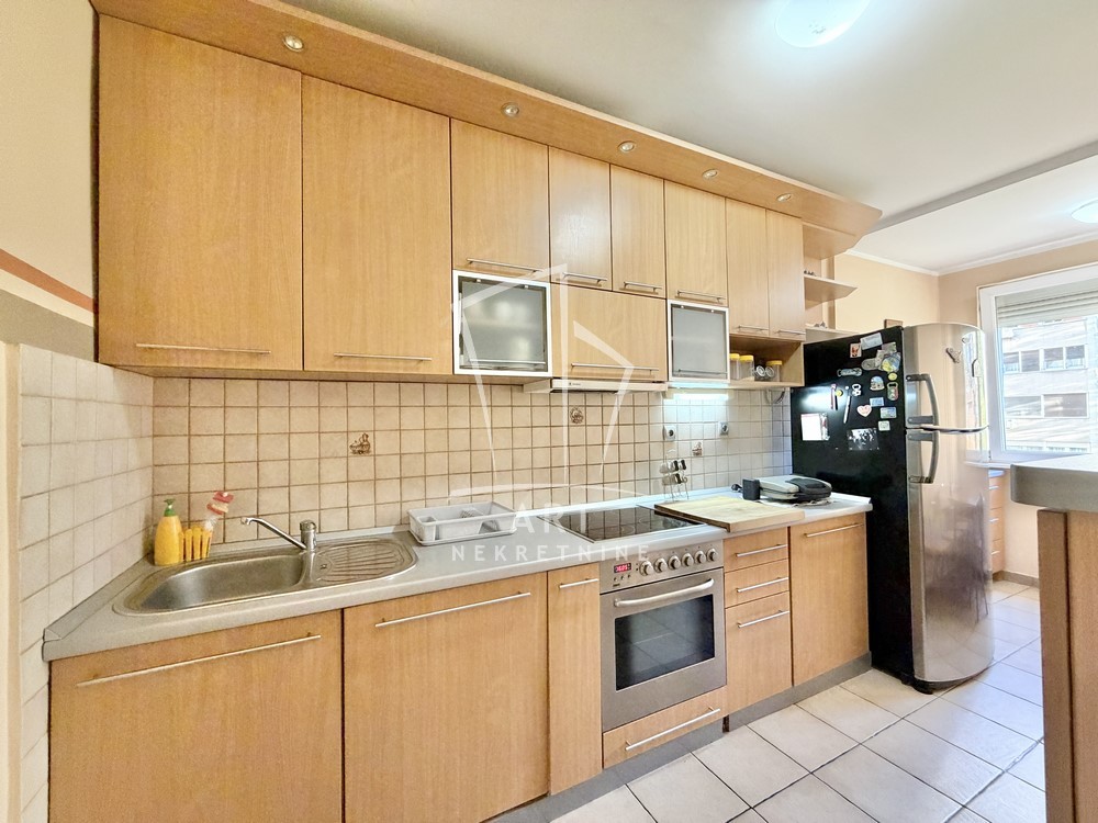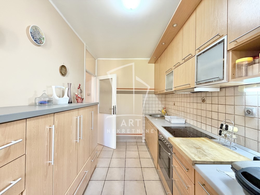 Ugradna kuhinja sa belom tehnikom, tri spavaće sobe plus dnevni boravak, dva mokra čvora, CG, Topla voda.
