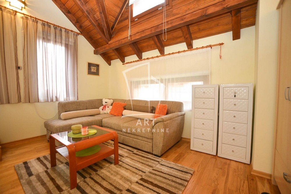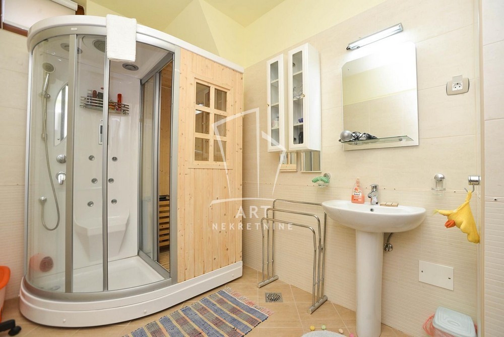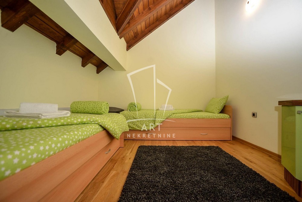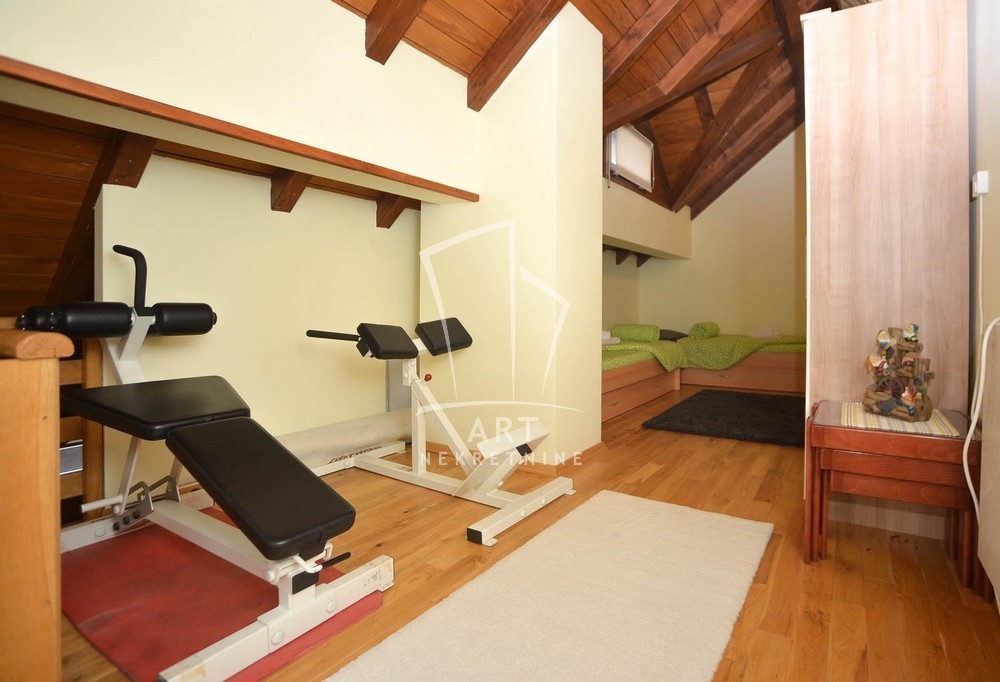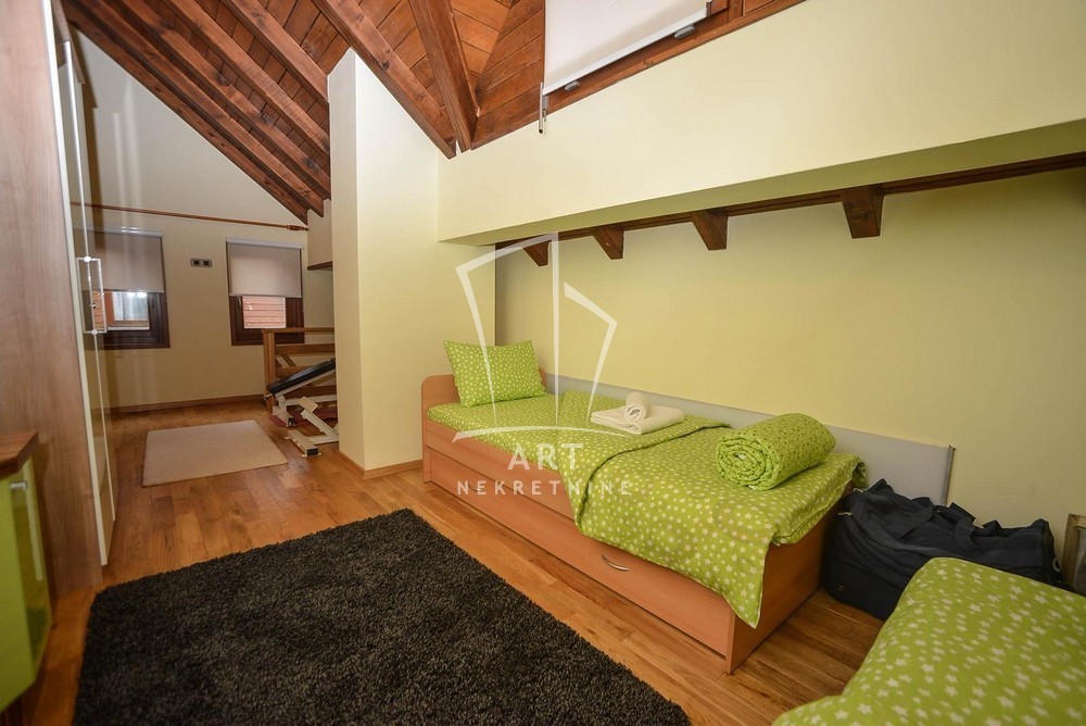 Na prvom spratu se nalaze dve spavaće sobe i veoma prostrano kupatilo sa saunom, a na poslednjem spratu je smeštena još jedna spavaća soba.