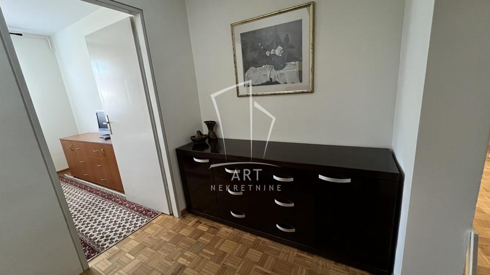 Sastoji se od prostranog dnevnog boravka, trpezarije, kuhinje i tri sobe, ima dva mokra čvora i dve lođe.
