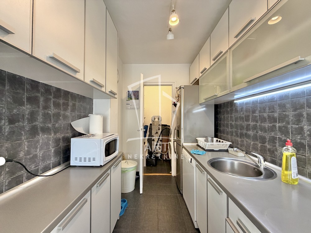 Prostorije: antre, veliki dnevni boravak, kuhinja sa trpezarijom, dve prostrane spavaće sobe, ostava, kupatilo i dve terase koje ne ulaze u kvadraturu. Stan ima i pripadajući podrum.