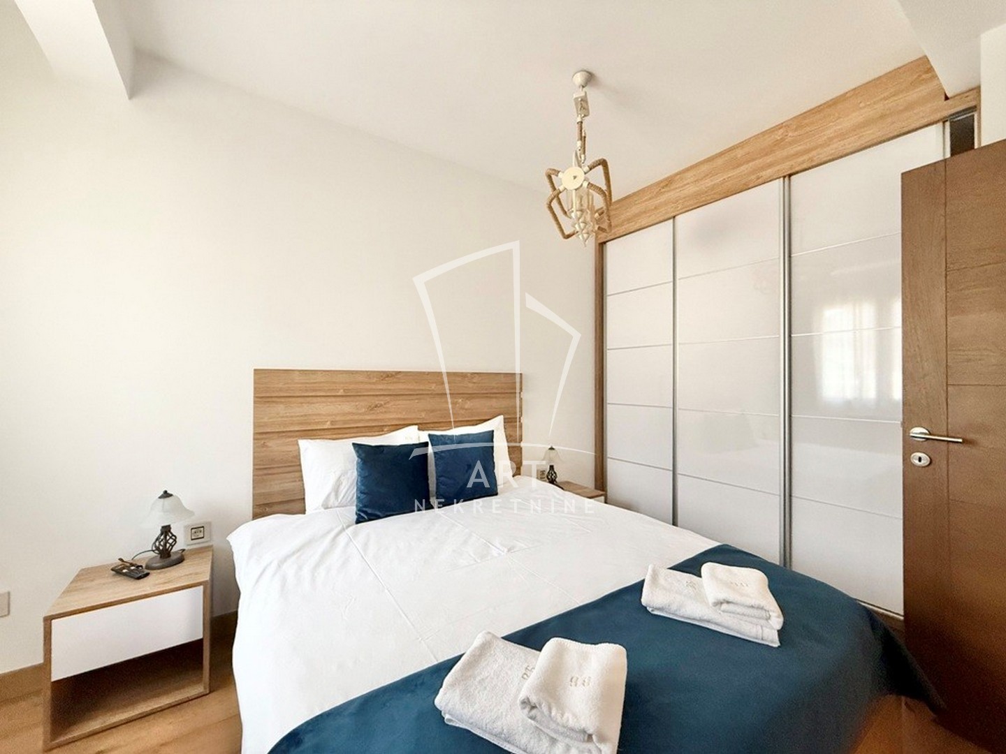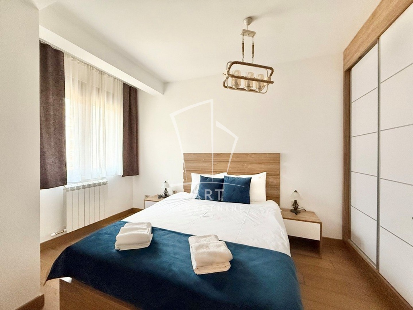 Sastoji se od predsoblja, dnevne sobe sa trpezarijom i kuhinjom, spavaće sobe, kupatila i terase. Grejanje je etažno na stuju. Severno je orijentisan.