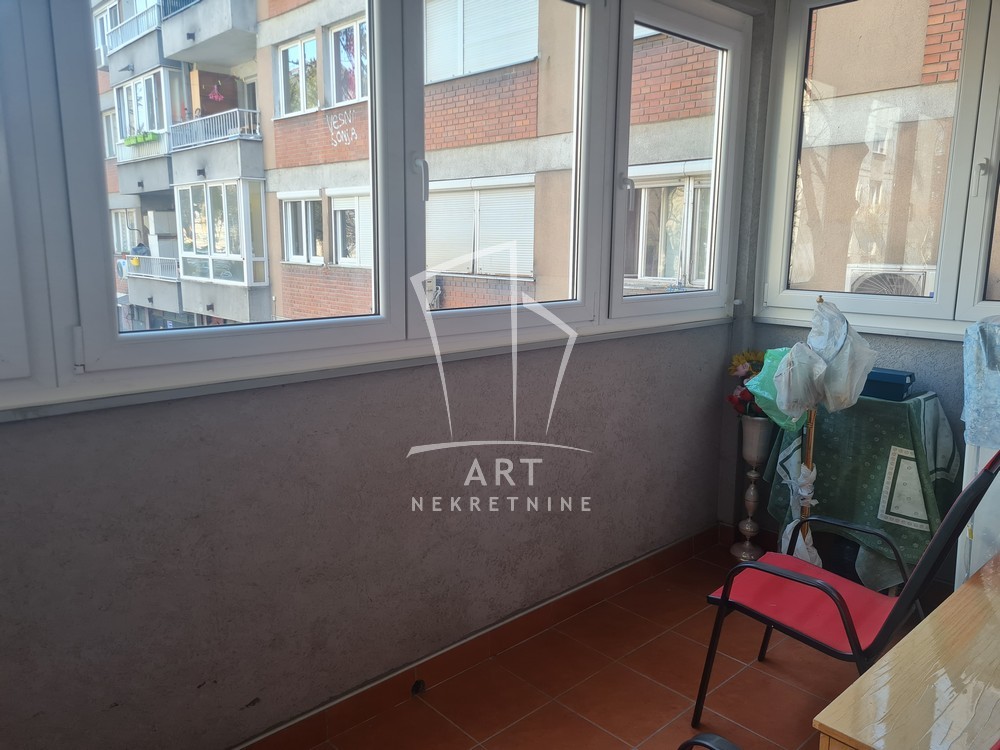 Stan je orijentisan na 2 strane.Nalazi se na prvom spratu i ima dve lepe zastakljene terase.Ima dve spavaće sobe, kuhinju sa trpezarijom, ostavu, veliki dnevni boravak, kupatilo i wc za goste.