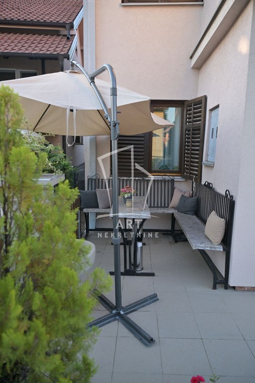 U potkrovlju je stan u sivoj fazi, sa izvedenom infrastrukturom za vodu i struju, otvorenim rasporedom bez pregradnih zidova. Terasa ispred stana pruža mir i privatnost.