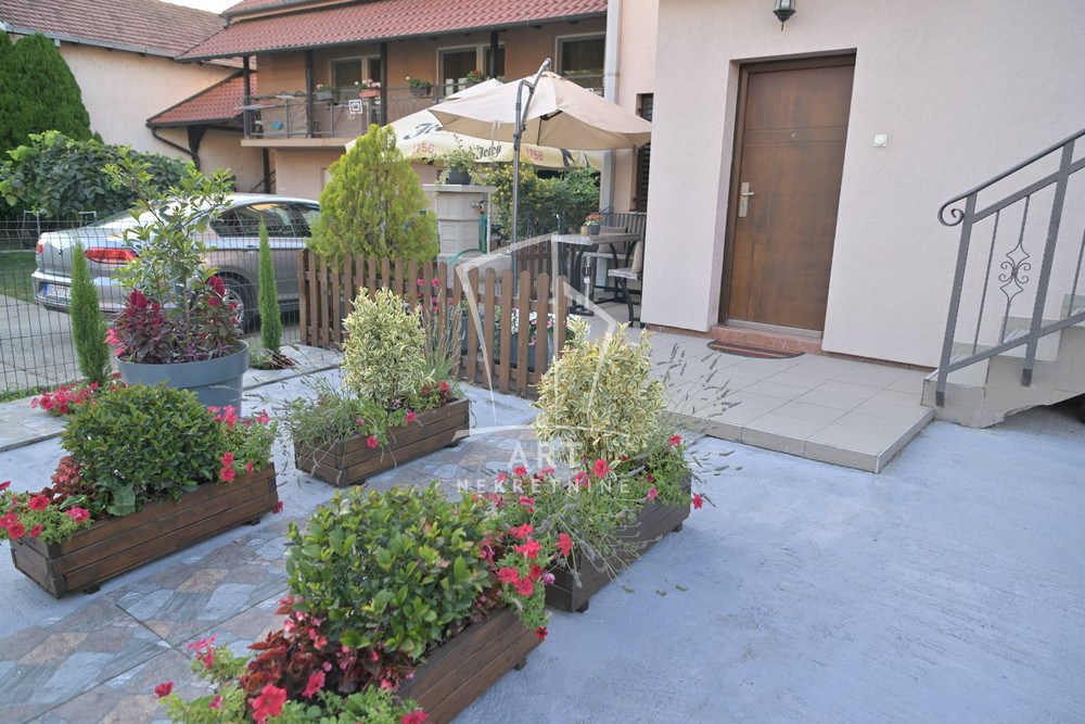 U prizemlju je četvorosoban stan ispred kog se nalazi uređena terasa s prostorom za odmor. Raspored obuhvata modernu dnevnu sobu sa kuhinjom i trpezarijom, spavaću sobu povezanu s dnevnim prostorom, dok su hodnikom odvojene još dve spavaće sobe, kupatilo i špajz.