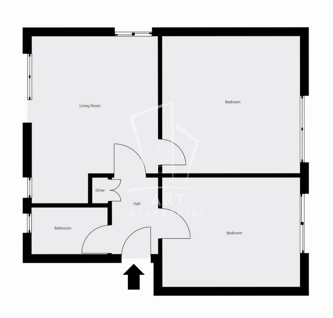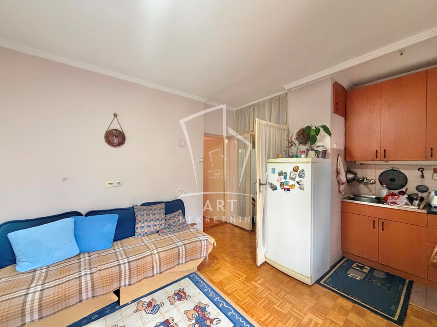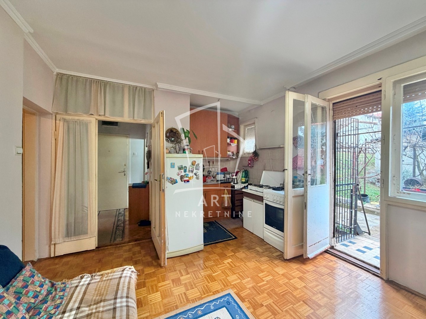 Sastoji se od dnevne sobe sa kuhinjsko trpezarijskim prostorom iz koje se izlazi na terasu i u dvorište koje pripada stanu , dve spavaće sobe i kupatila.