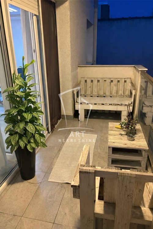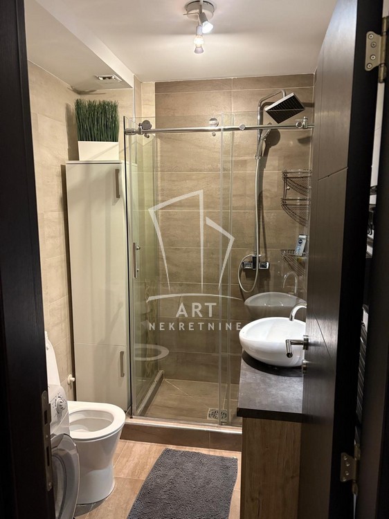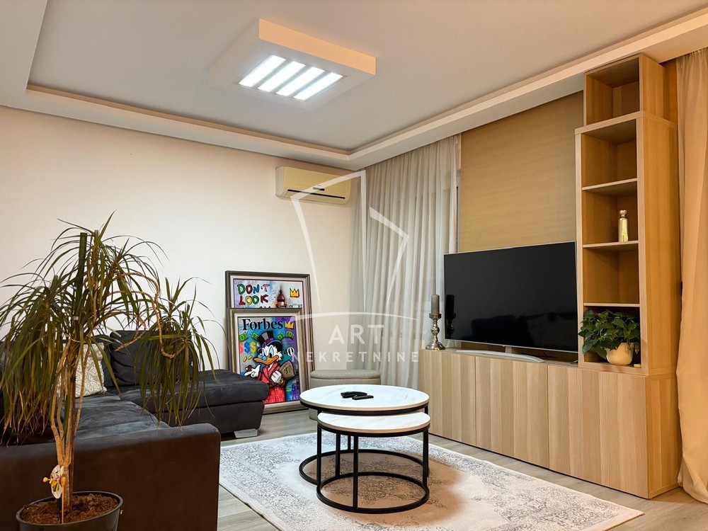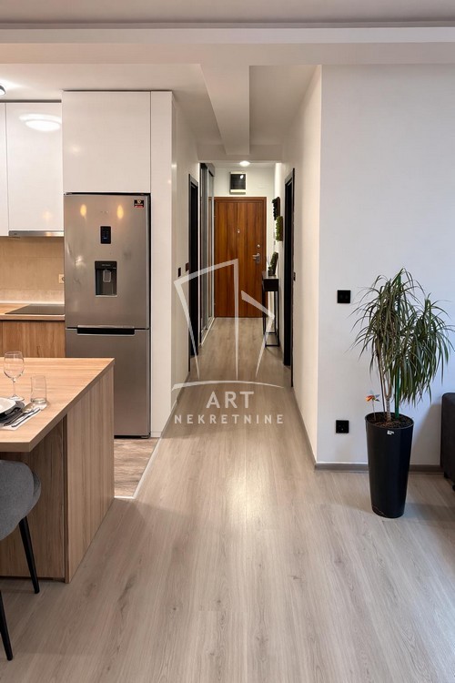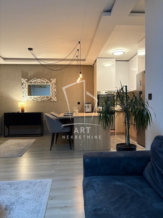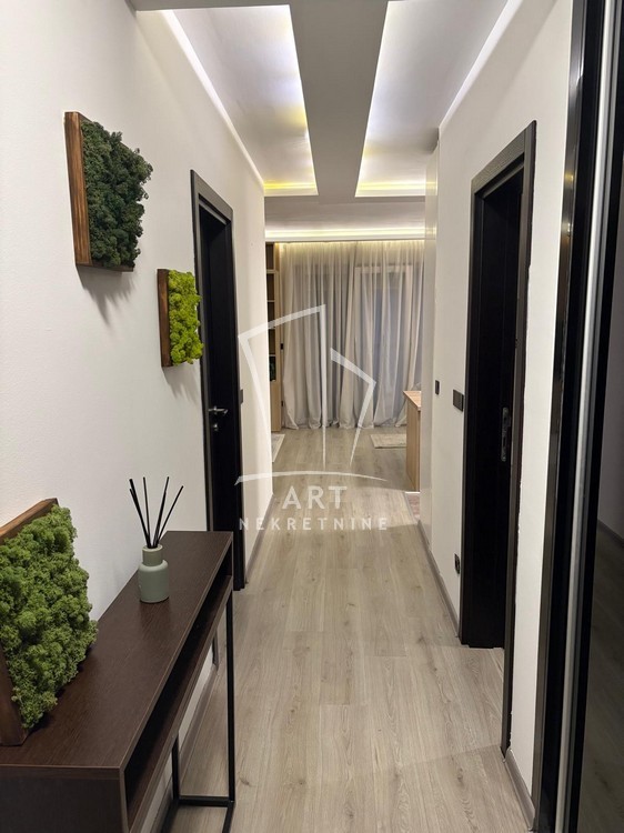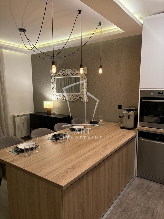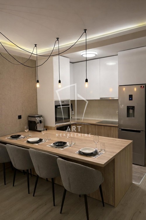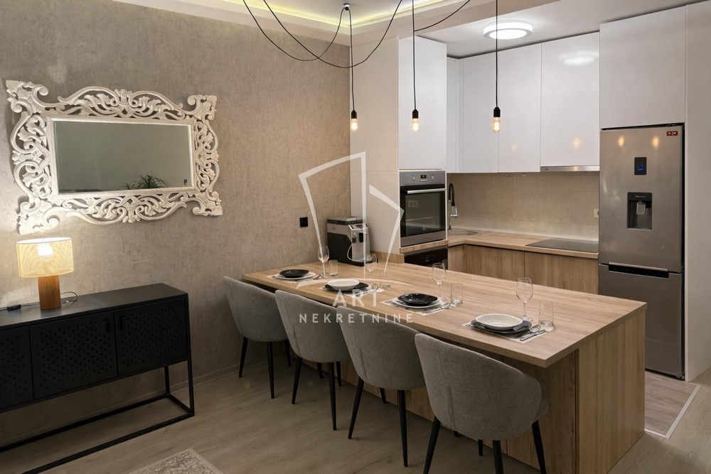 Enterijer je luksuzno uređen, sa pažljivo biranim detaljima koji pružaju maksimalan komfor i funkcionalnost, a stan je potpuno opremljen svim neophodnim uređajima i nameštajem .