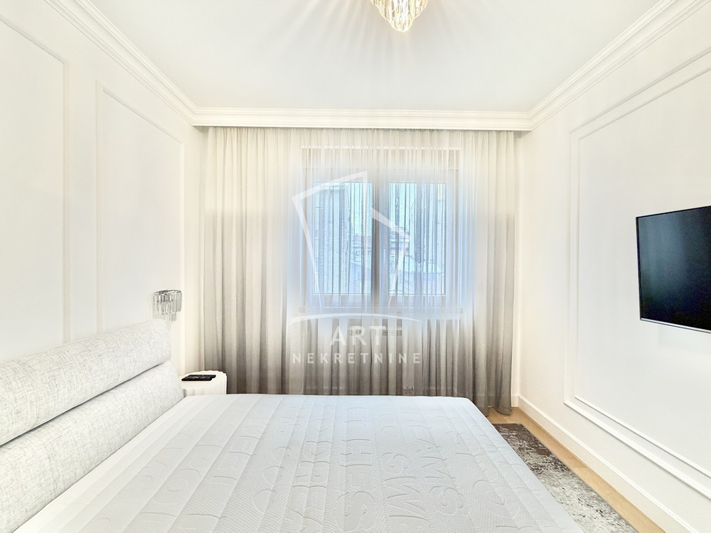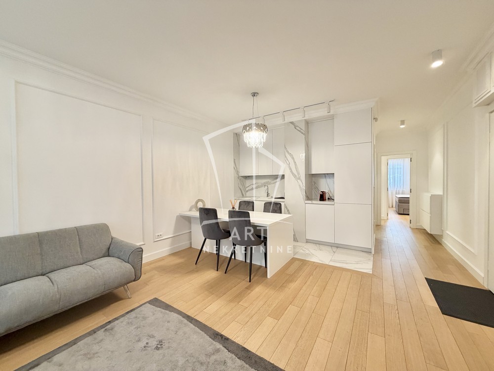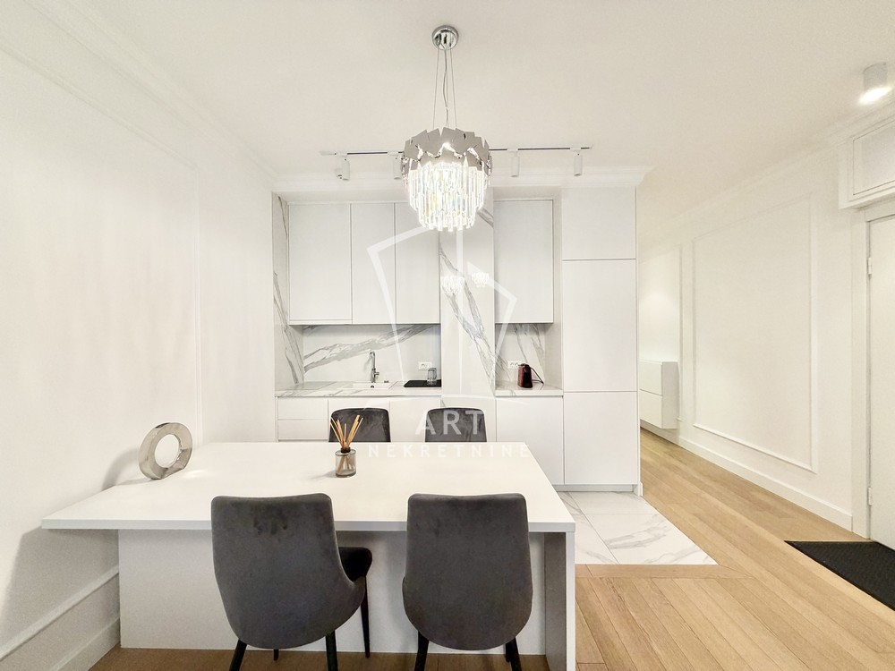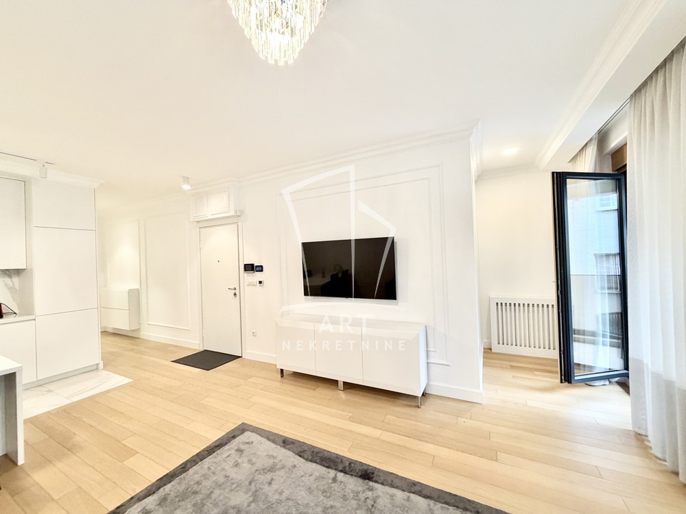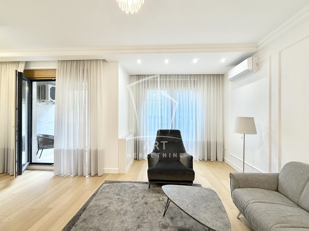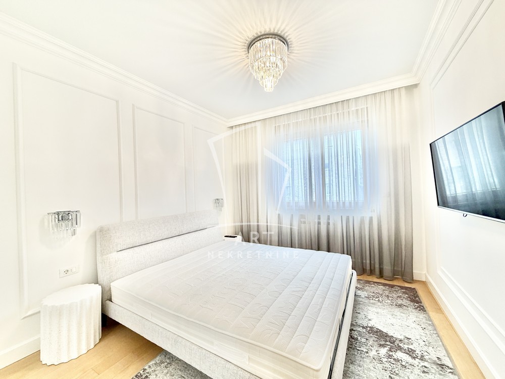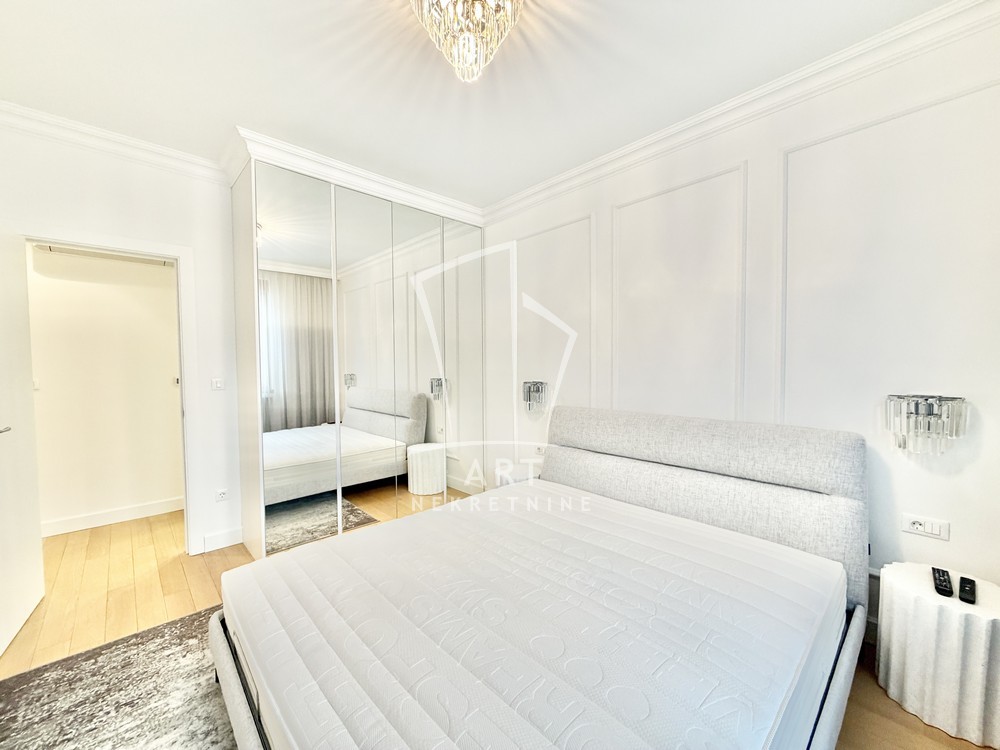 Sastoji se od velike, reprezentativne dnevne sobe, dve prostrane spavaće sobe, dva luksuzno opremljena kupatila i terase. Kompletno je opremljen Natuzzi nameštajem rađenim od visokokvalitetnih materijala, sa savremenim dizajnom.Svaki detalj u stanu pažljivo je biran kako bi pružio maksimalan komfor i osećaj ekskluzivnosti.