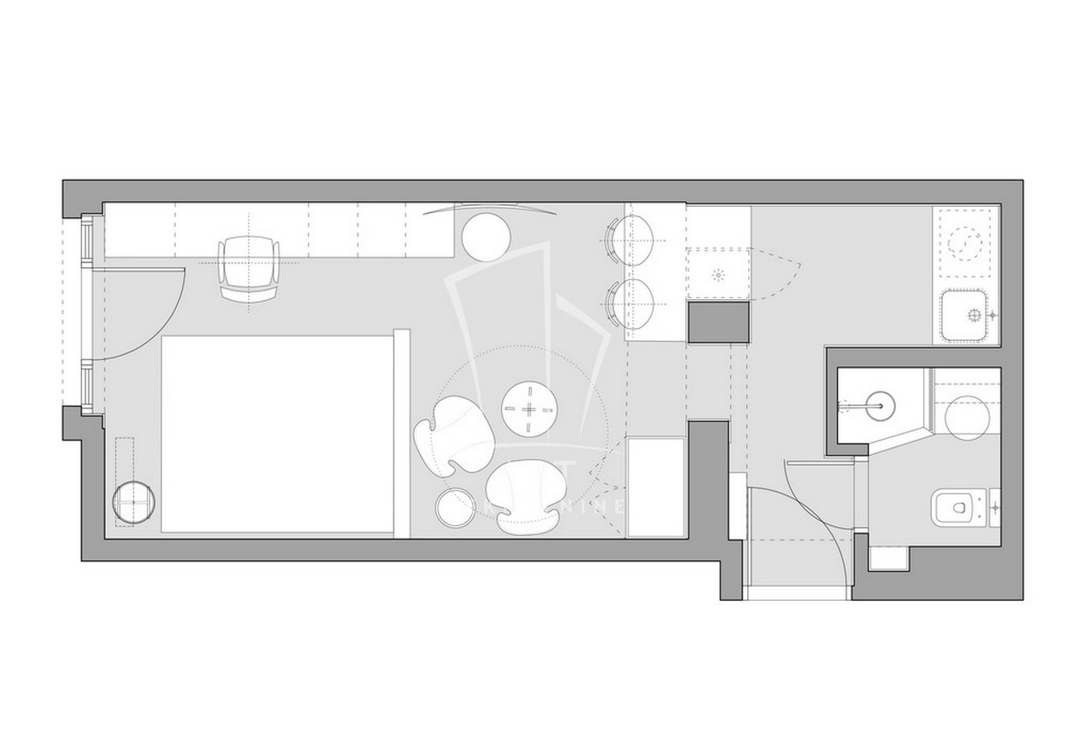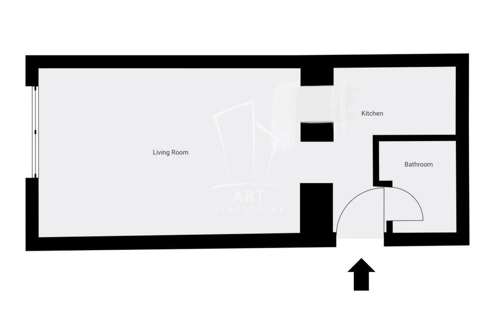 Studio se sastoji od kupatila sa tuš kabinom, kuhinje i sobe koja je podeljena na dnevni boravak i prostor za spavanje sa izlazom na terasu.