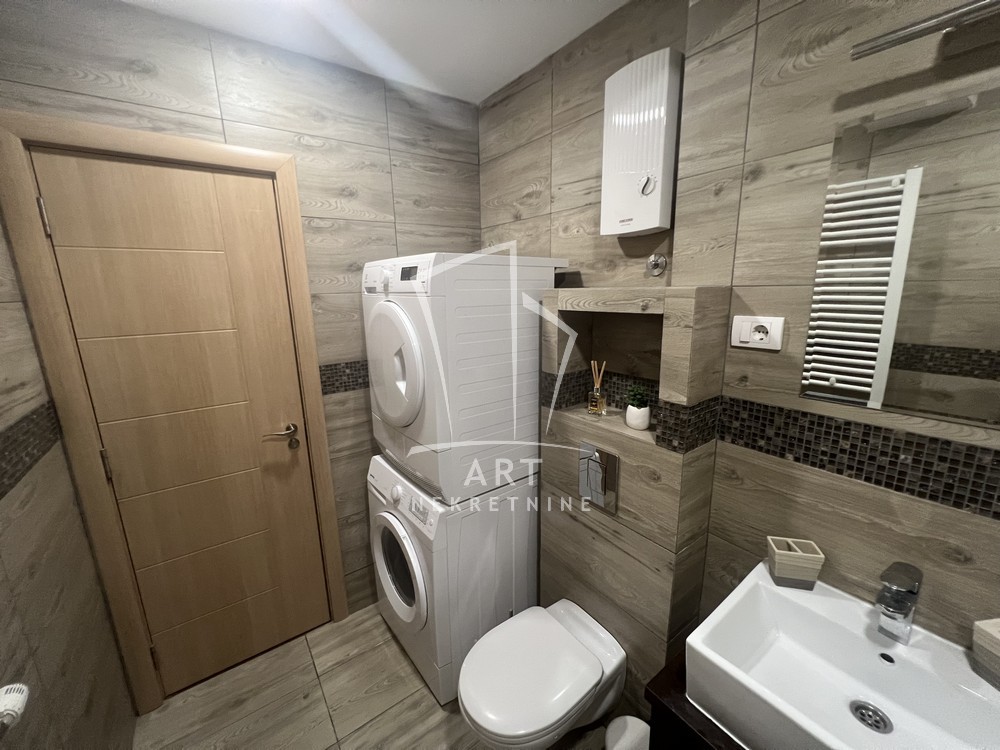 Svetao, ukusno uređen i izuzetno funkcionalan, stan poseduje dve odvojene spavaće sobe, prostran dnevni boravak sa trpezarijskim delom, modernu kuhinju sa svim neophodnim elementima, terasu kao i luksuzno kupatilo u kojem se nalaze mašina za pranje i mašina za sušenje veša.