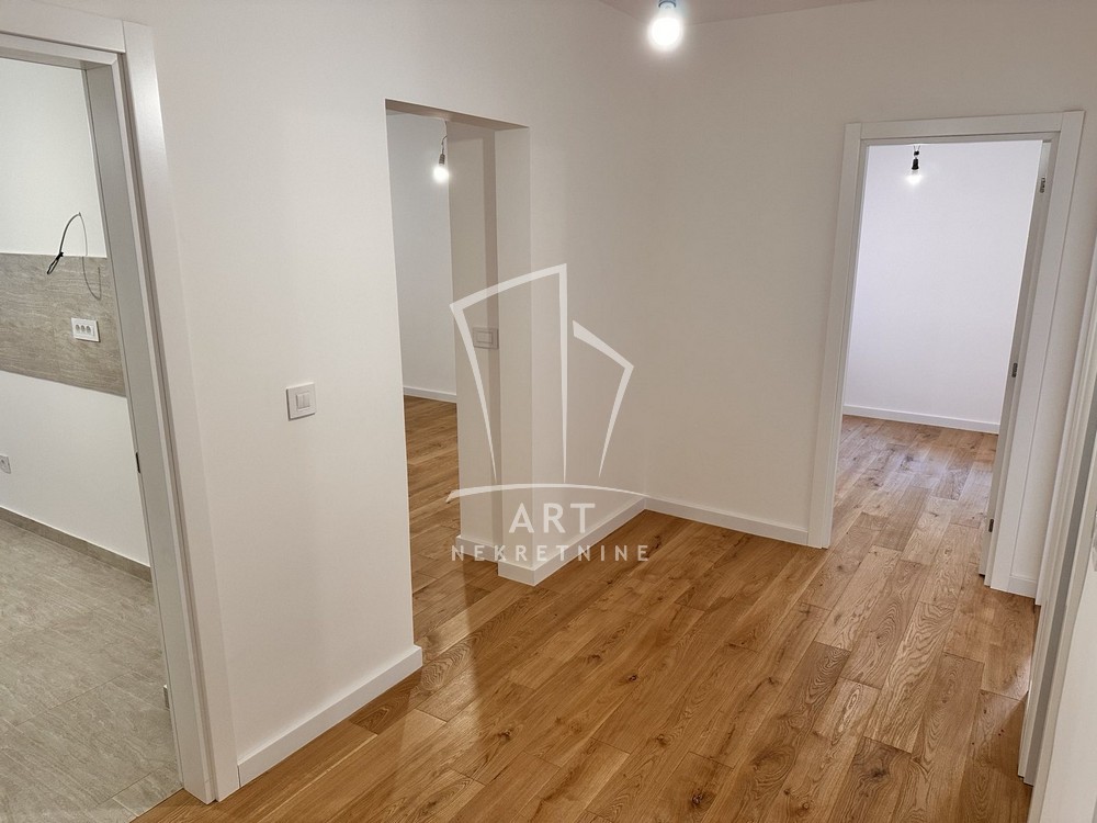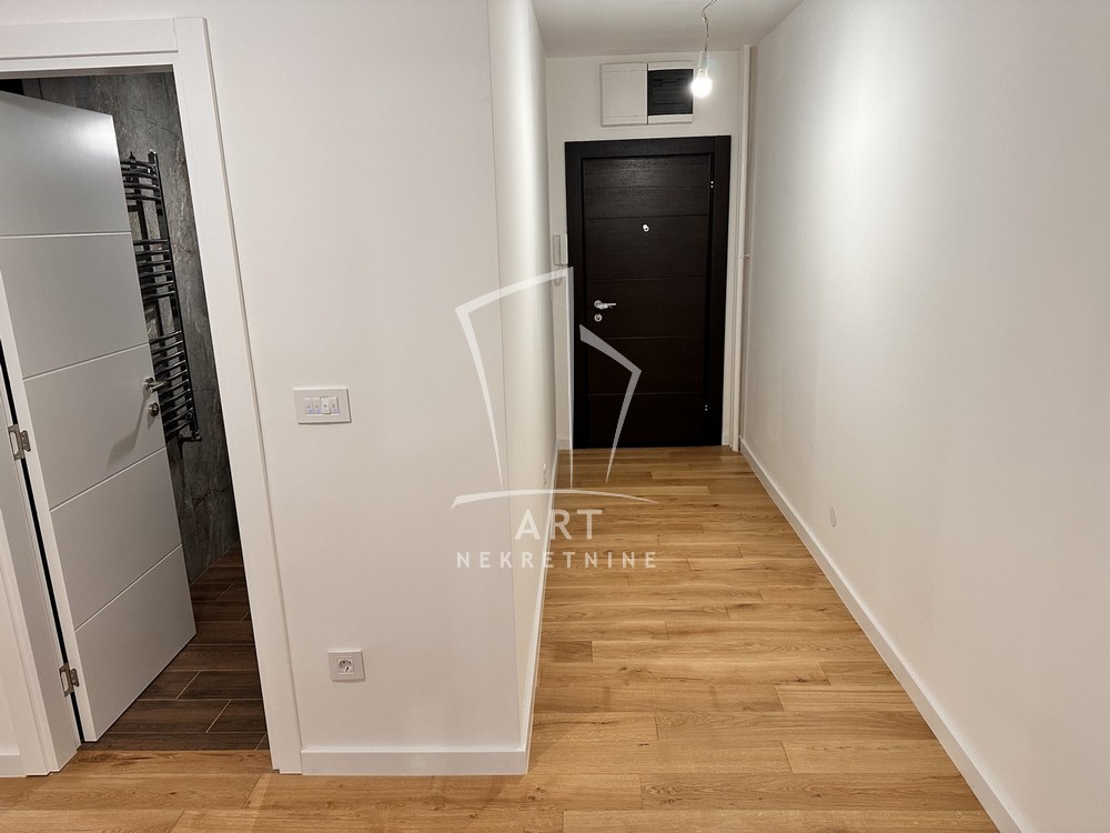 Stan je dvostrano orijentisan (jug-zapad) i sastoji se od prostrane dnevne sobe sa kuhinjom i trpezarijom, ulaznog hodnika, kupatila i dve spavaće sobe. U stanu su promenjene i ugradjene visoko kvalitetne, potpuno nove elektro i vodovodne instalacije, postavljeni aluminijumski radijatori i aluminijumska stolarija u antracit boji.