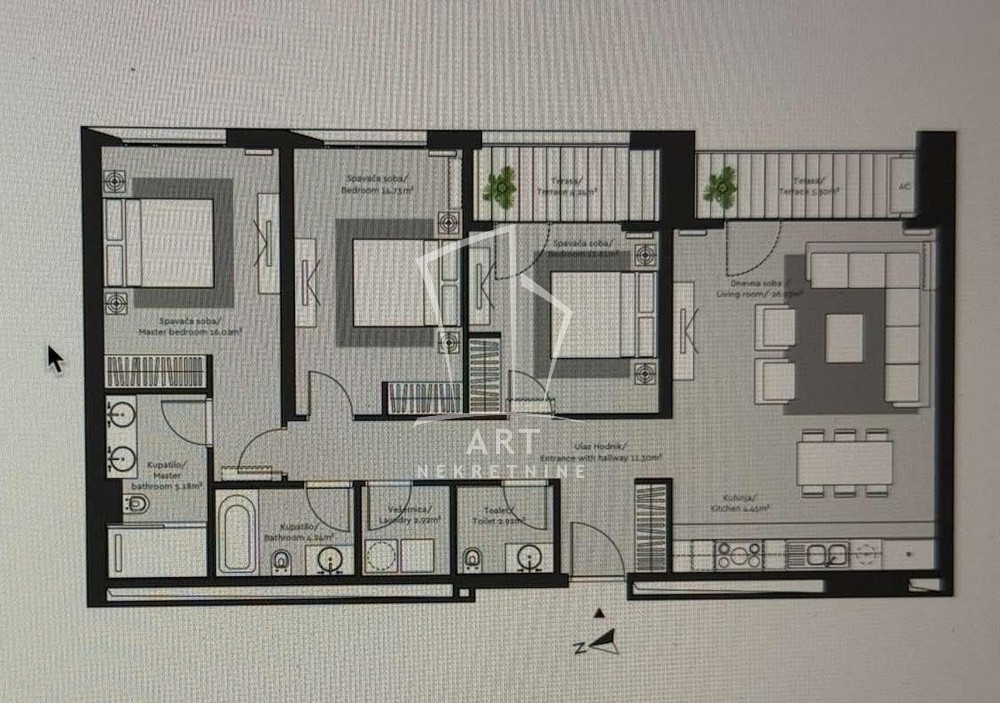 - Četvorosoban stan sa 2 kupatila, 1 toaletom i zasebnim vešerajem