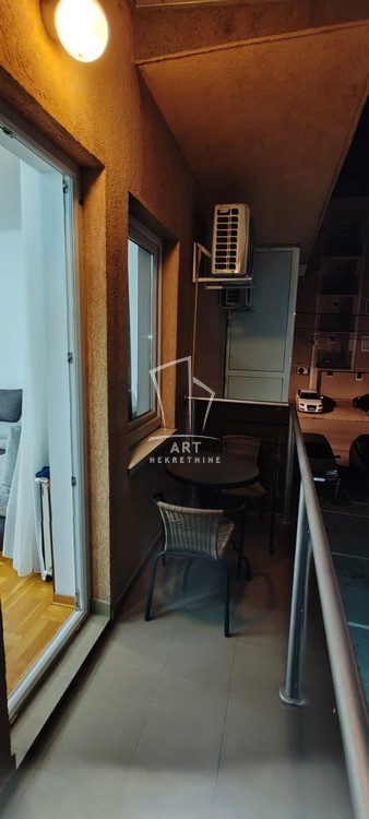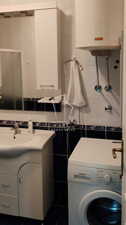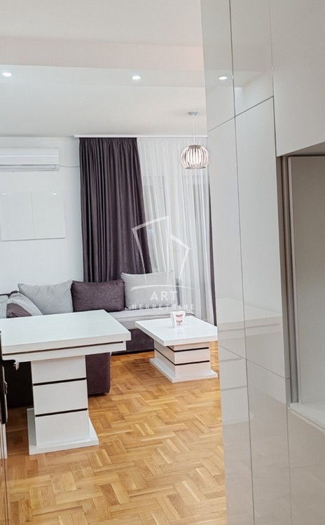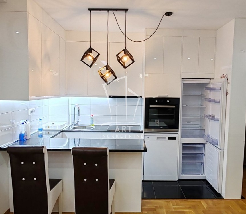 Stan je kompletno i kvalitetno namešten, a njegov raspored obuhvata prostran dnevni boravak, udobnu spavaću sobu sa francuskim ležajem i ugradnim plakarom, moderno kupatilo, kao i funkcionalnu kuhinju sa visokim šankom i svim neophodnim elementima i aparatima (frižider, šporet sa rernom, mašina za sudove).