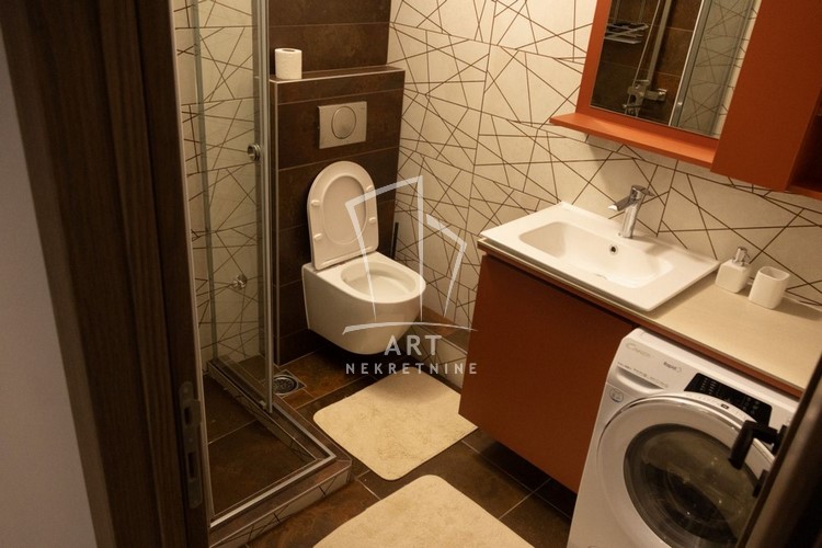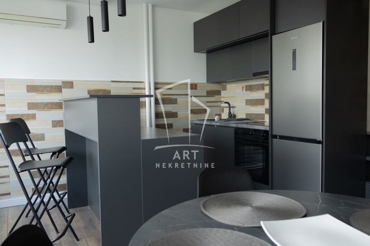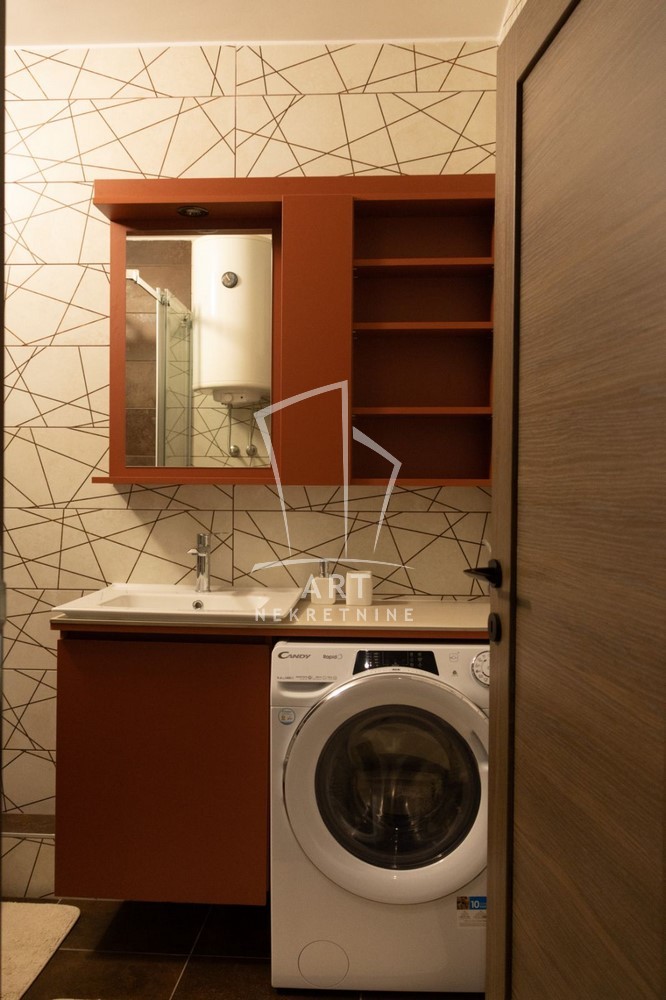 Stan je opremljen kompletnom belom tehnikom koja je u garanciji - sudo mašina, mašina za pranje i sušenje veša, frižider sa velikim zamrzivačem, keramička ploča i rerna, bojler.