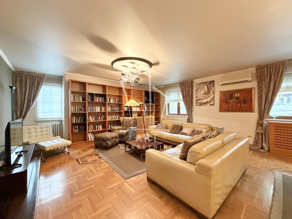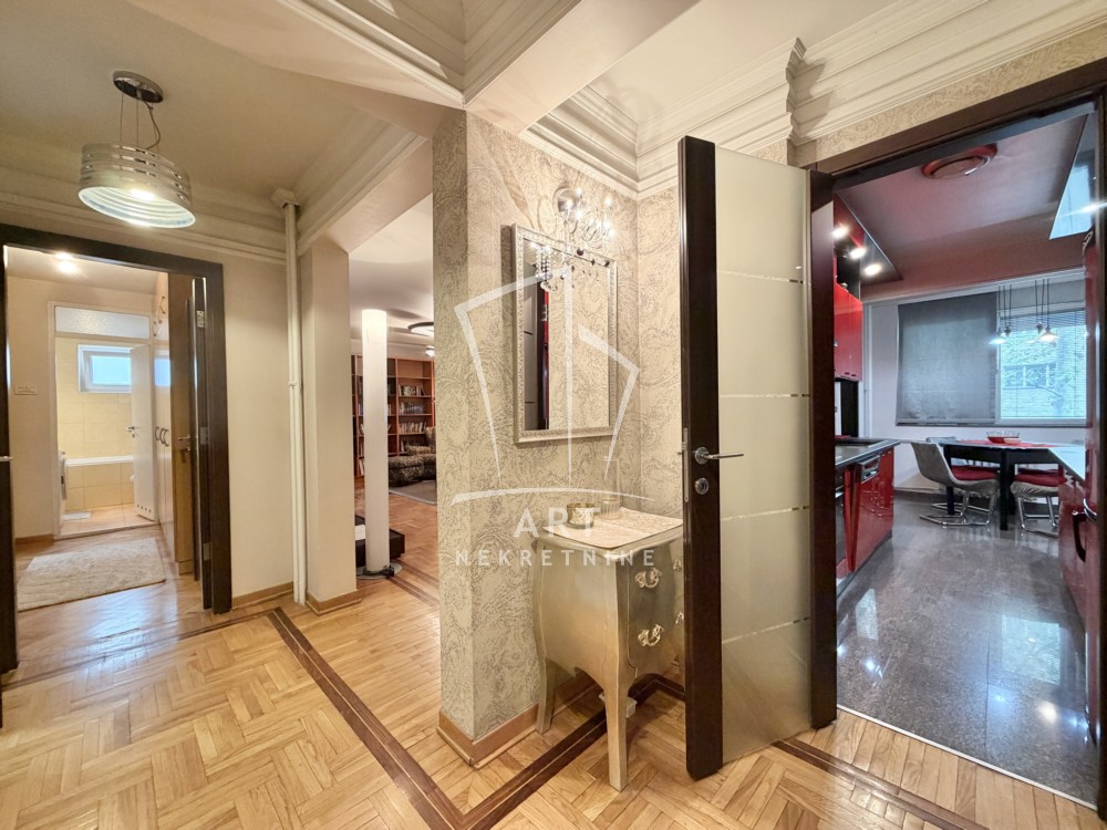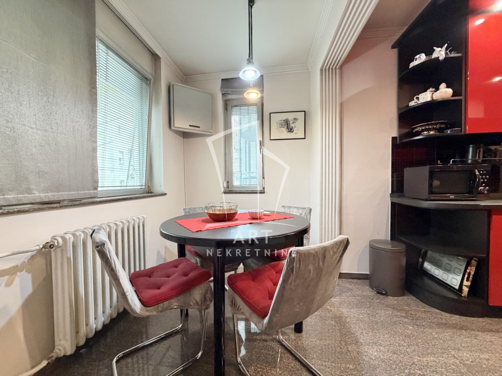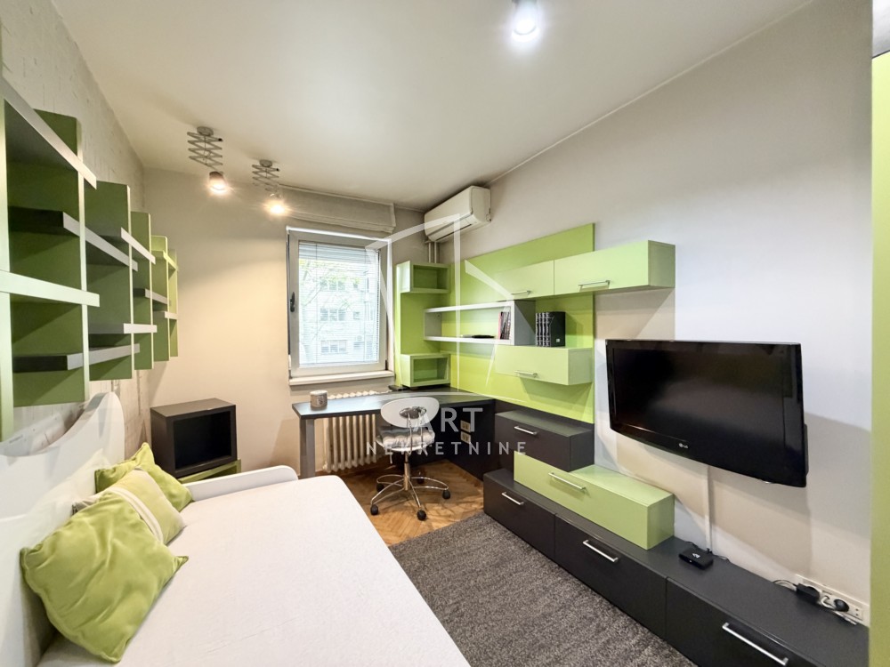 Stan je izuzetno prostran i komforan, opremljen kvalitetnim nameštajem, trostrano orijentisan, sa dve spavaće sobe. Ima četiri inverter klima uređaja, tri TV-a, optički internet a grejanje je centralno.