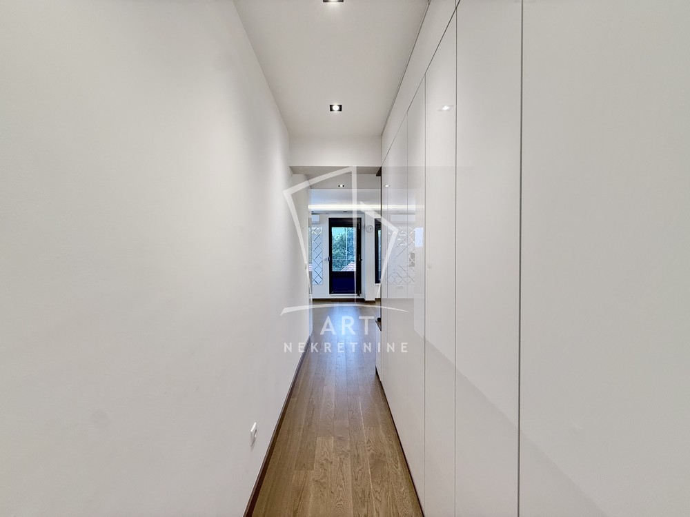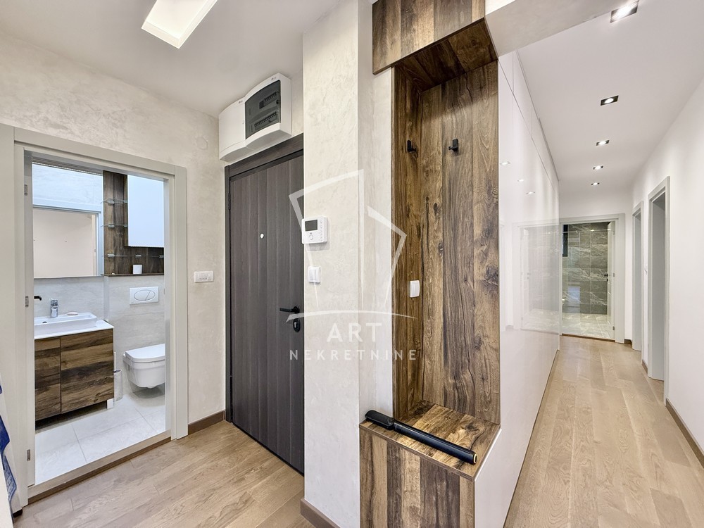 U stanu ostaje kompletno ugrađena kuhinja od medijapana, američki plakari sa osvetljenjem,ormar u hodniku sa cipelarnikom dug 5m, zastakljenu terasu, komarnike na svim prozorima, vrhunska bravarija, blanco sudopera kao česma sa filterom za vodu., klima uređaj…