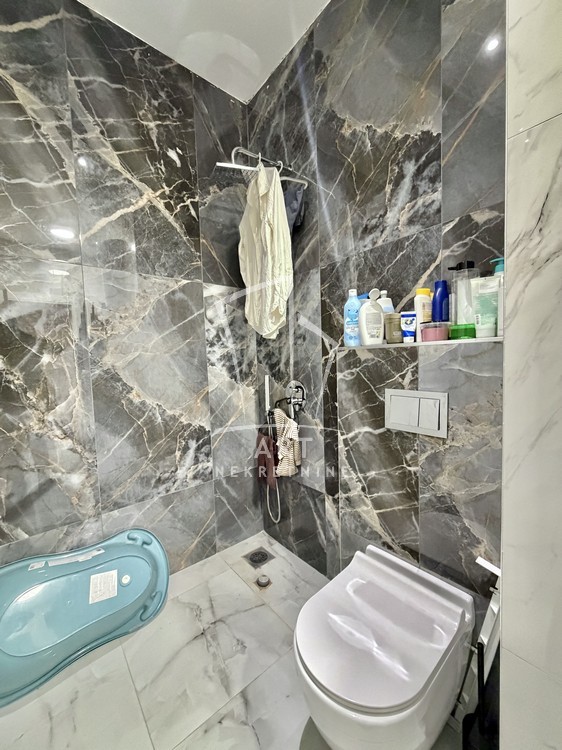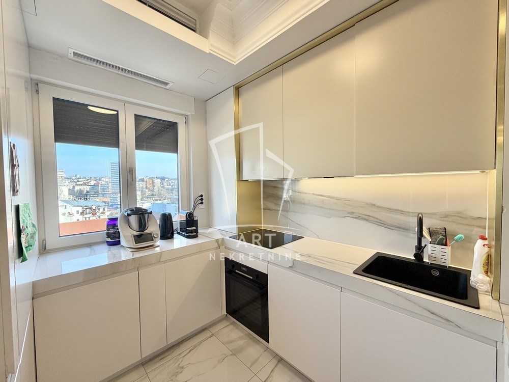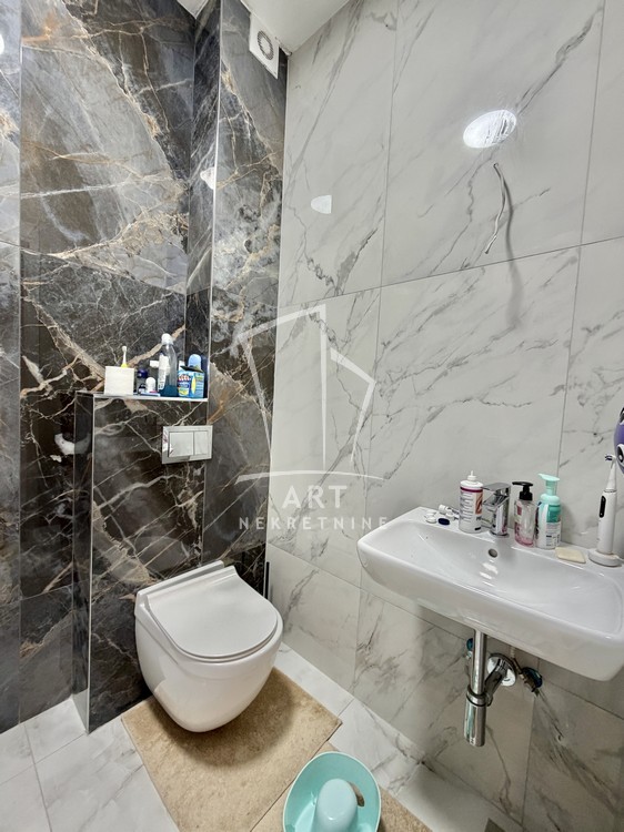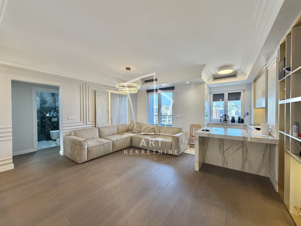 Stan se prodaje kompletno namešten, sa pažljivo biranim detaljima: mermerni paneli, dekorativna rasveta i ogledala doprinose estetskom utisku i ekskluzivnom ambijentu.