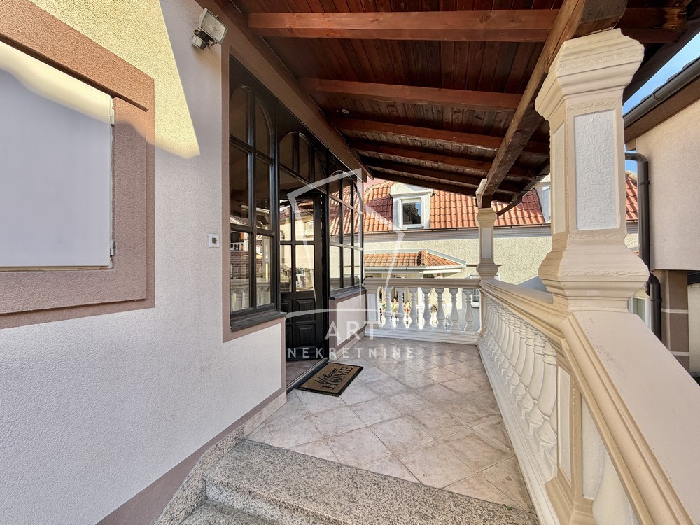 Kuća je na tri nivoa (pr+1+ptk) sa komfornim terasama, na kraju dvorišta se nalazi p/m. Samo ovoj kući na korišćenje pripada lep odvojeni deo dvorišta.
