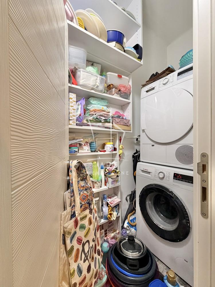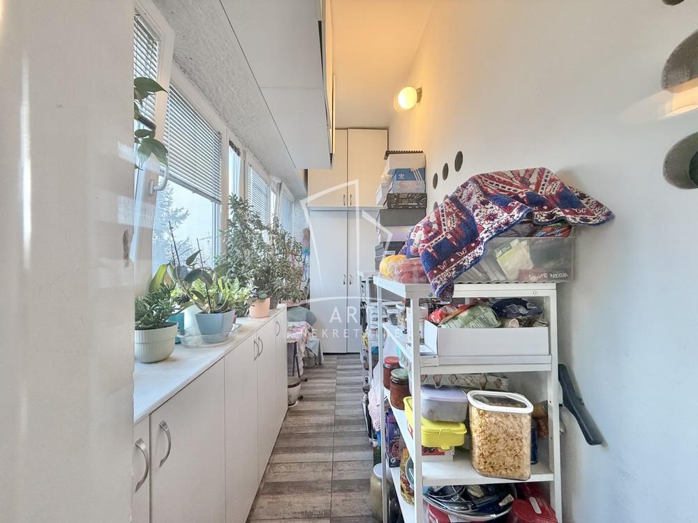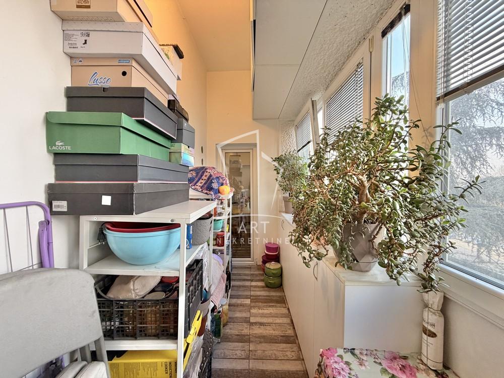 Sastoji se od hodnika, dnevno - trpezarijskog dela, potpuno odvojene, prostrane i sasvim opremljene kuhinje, 2 spavaće sobe, kupatila sa kadom, ostave sa perionicom i terase koja je zastakljena.