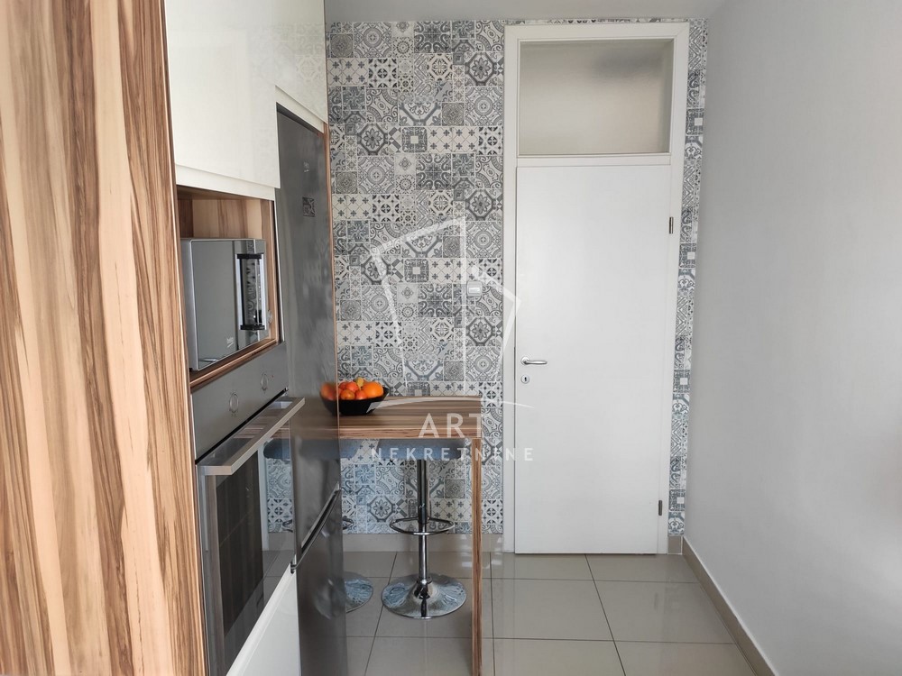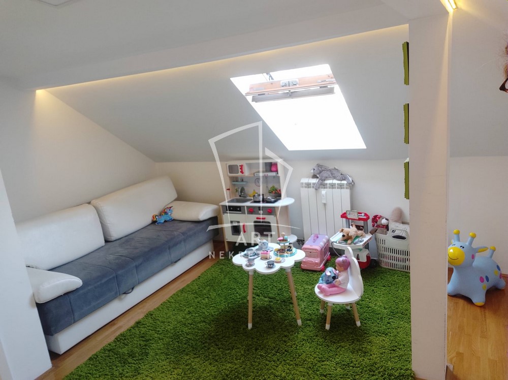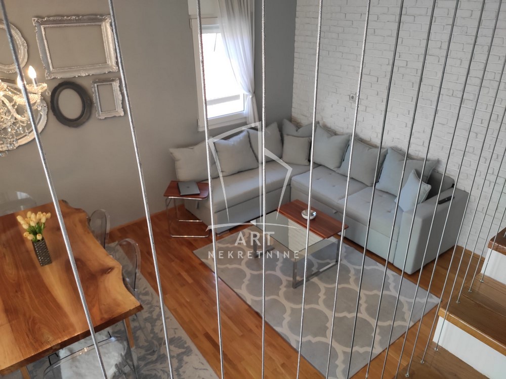 Stan se sastoji iz dve etaže. Na donjoj se nalaze prostrana dnevna soba sa kaminom,trpezarija,kuhinja i kupatilo.Ručno rađene stepenice vode na gornju etažu gde se nalaze dve komforne spavaće sobe. Grejanje je centralno,a stan poseduje i klimu.