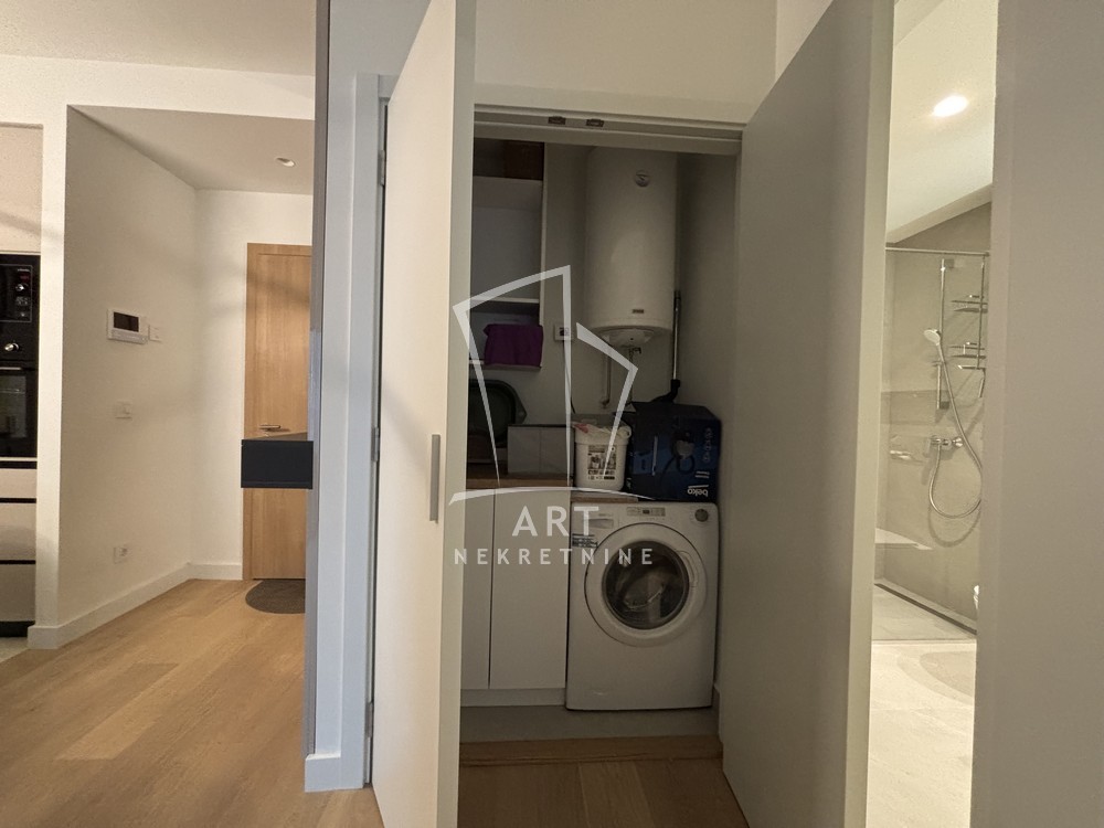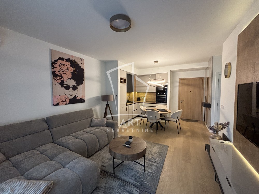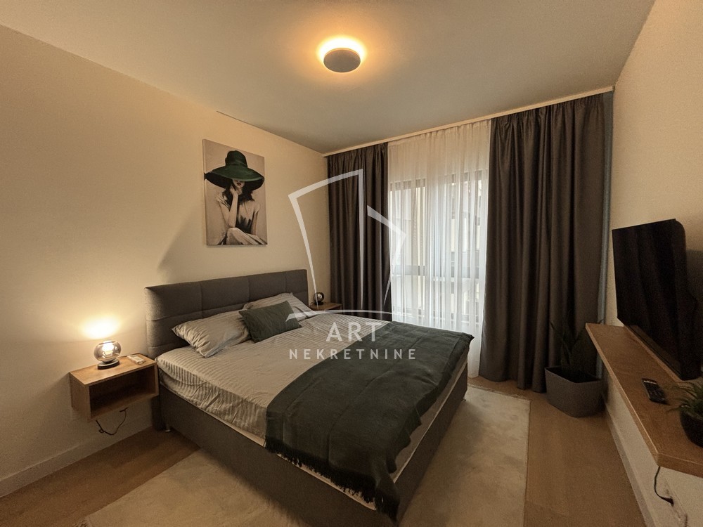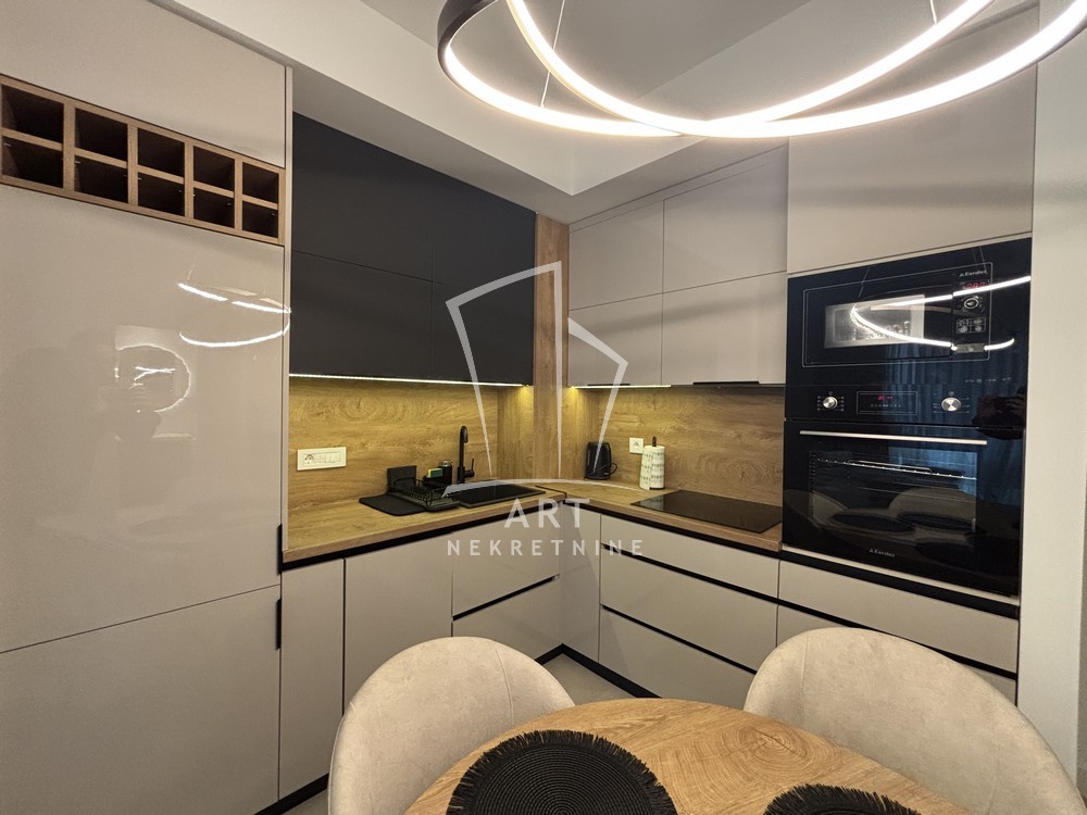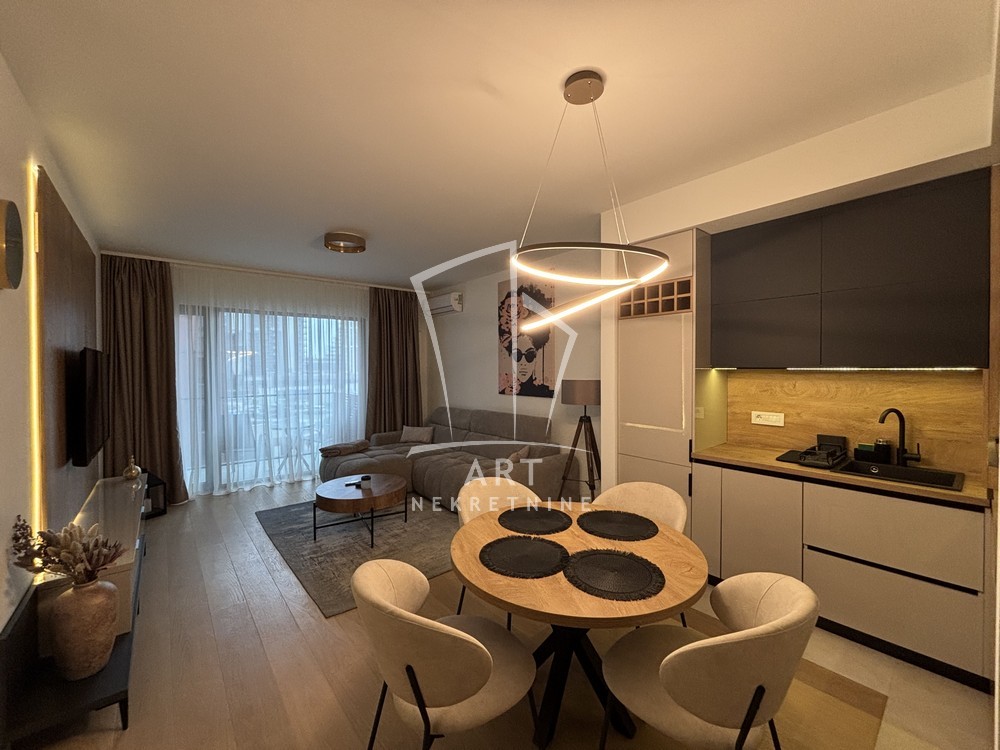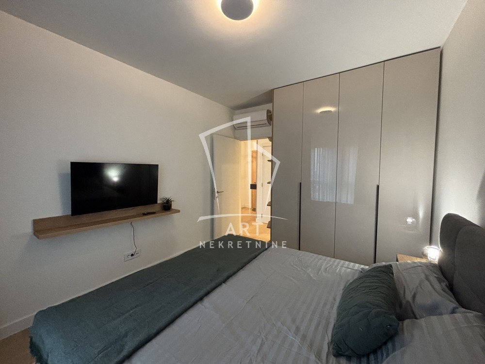Enterijer je moderno opremljen, sa novim nameštajem i tehnikom, pažljivo biranim detaljima i maksimalno iskorišćenim prostorom. Raspored je funkcionalan: dnevna soba sa kuhinjom i trpezarijom, odvojena spavaća soba, kupatilo, terasa i zasebna ostava koja pruža dodatni komfor i prostor za odlaganje.