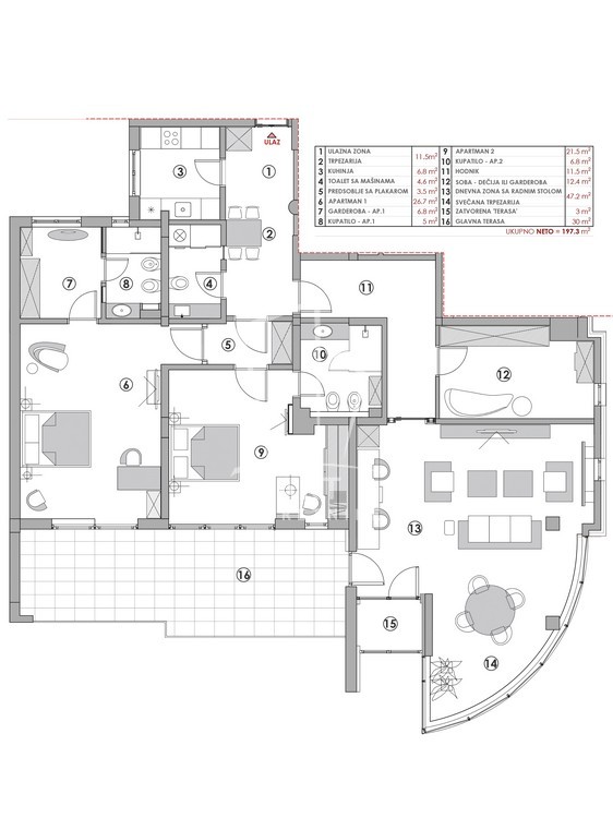 Stanu pripada velika terasa i garažno mesto.