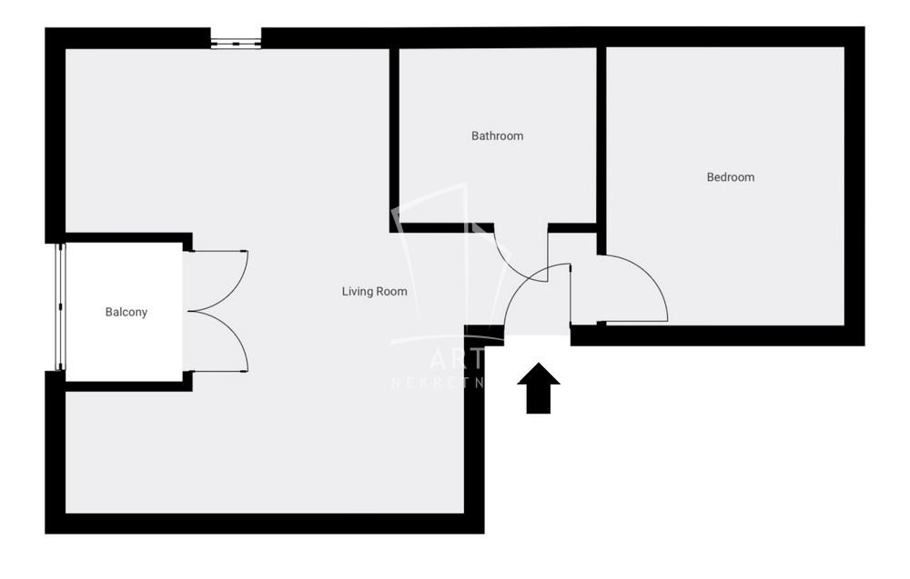 Prostorije: ulazni hodnik, kuhinja-trpezarija-dnevna soba (sa izlazom na terasu), spavaća soba, kupatilo.