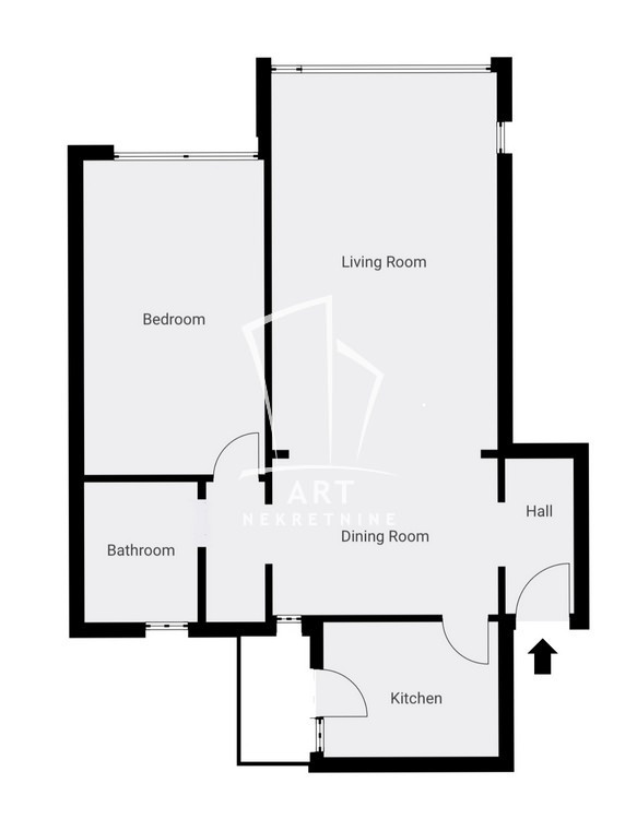 Prostorije: predsoblje, kupatilo, spavaća soba, velika dnevna soba, kuhinja, lođa, podrum.