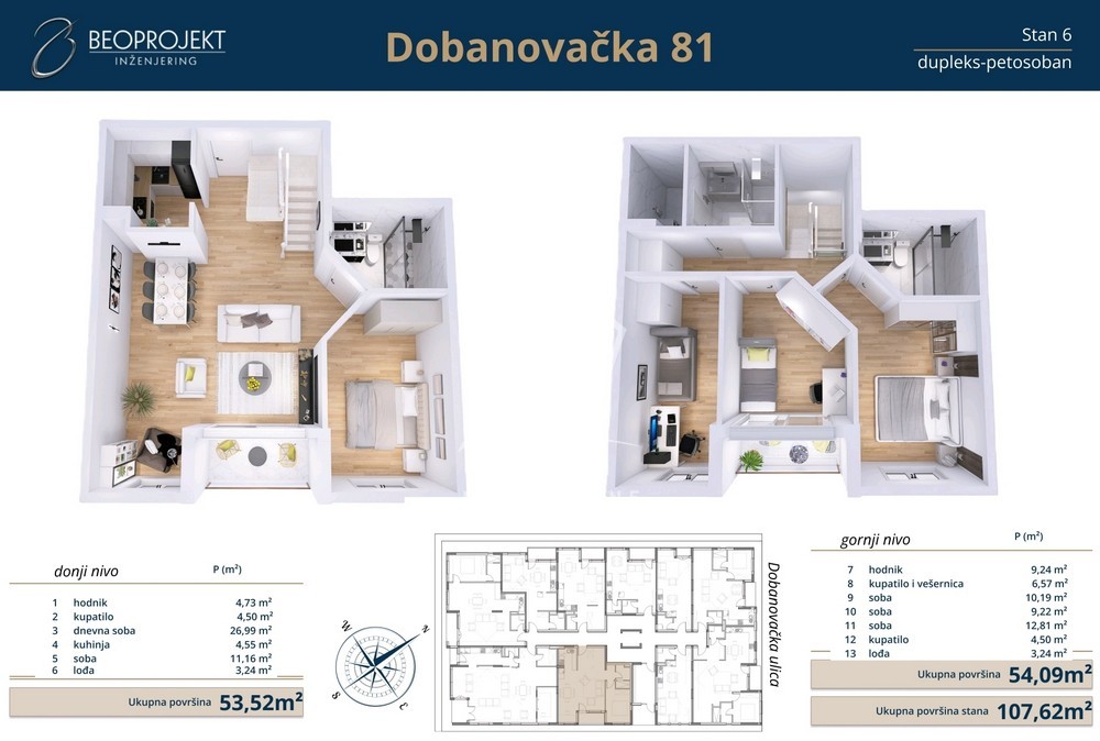 Moderan objekat u mirnom delu Zemuna nadomak svih neophodnih sadržaja. Stan je opremljen smart sistemom sa daljinskom kontrolom svih uređaja. Stolarija je aluminijumska sa dvoslojnim staklom, roletne na elektro pogon, grejanje je podno, višeslojni Tarkett, italijanska keramika 1. klase, izolacija kamena vuna 10cm. Donji nivo se sastoji od dnevne sobe sa trpezarijom, kuhinje, kupatila, spavaće sobe i lođe. Na drugom nivou nalaze se tri spavaće sobe, dva kupatila, vešernica i lođa. Merena kvadratura stana je 108m2. Mogućnost kupovine garažnog ili parking mesta. Uredna dokumentacija, rok završetka radova jul 2026.