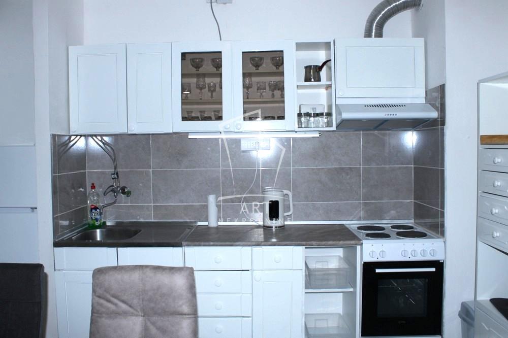 Kuhinja je opremljena elementima sa svim potrebnim uređajima i malim kućnim aparatima: usisivač, pegla, štapni mixer, ketler i posuđe.