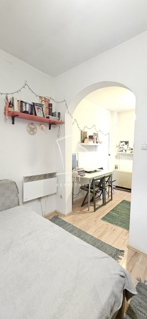 U mirnoj ulici na Vračaru, prodaje se odmah useljiva garsonjera sa baštom. Garsonjera je deo prizemnog objekta , kvalitetno izgrađena, sa fasadnom ciglom, zasebnim ulazom, dvorištem i ostavom od 3m2 u dvorištu. Visina plafona je 2.8m, tako da je moguća i nadogradnja. Garsonjera se prodaje nameštena sa novom kuhinjom i lepim kupatilom.