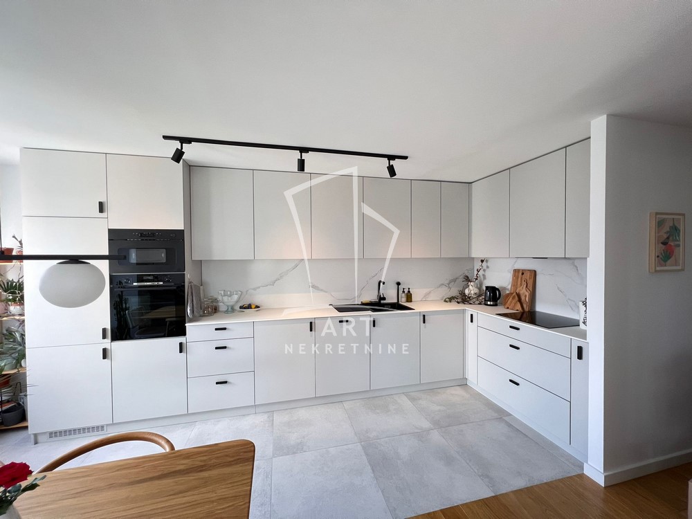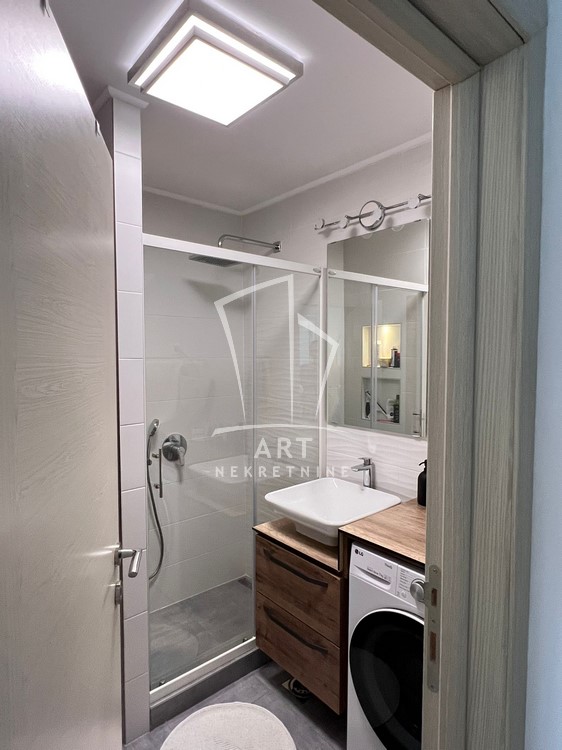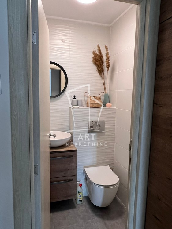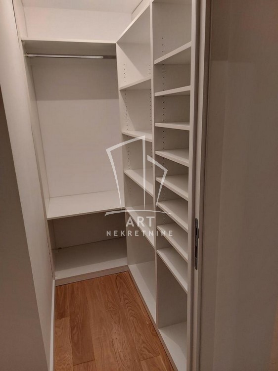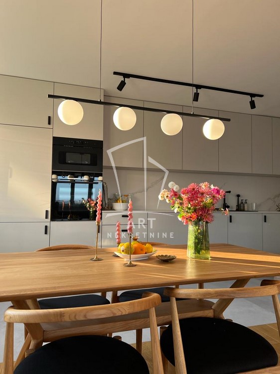 Sastoji se od predsoblja iz koga se ulazi u sve prostorije, kompletno opremljene kuhinje sa dnevno-trpezarijskim delom open-space koncepta sa izlazom na terasu veličine 10m2 sa koje se pruža predivan pogled, veće spavaće sobe, druge manje spavaće/radne sobe koja takođe ima izlaz na terasu, prostorije koja može biti garderober ili ostava u zavisnosti od potreba, kupatila sa tuš kabinom i toaleta.