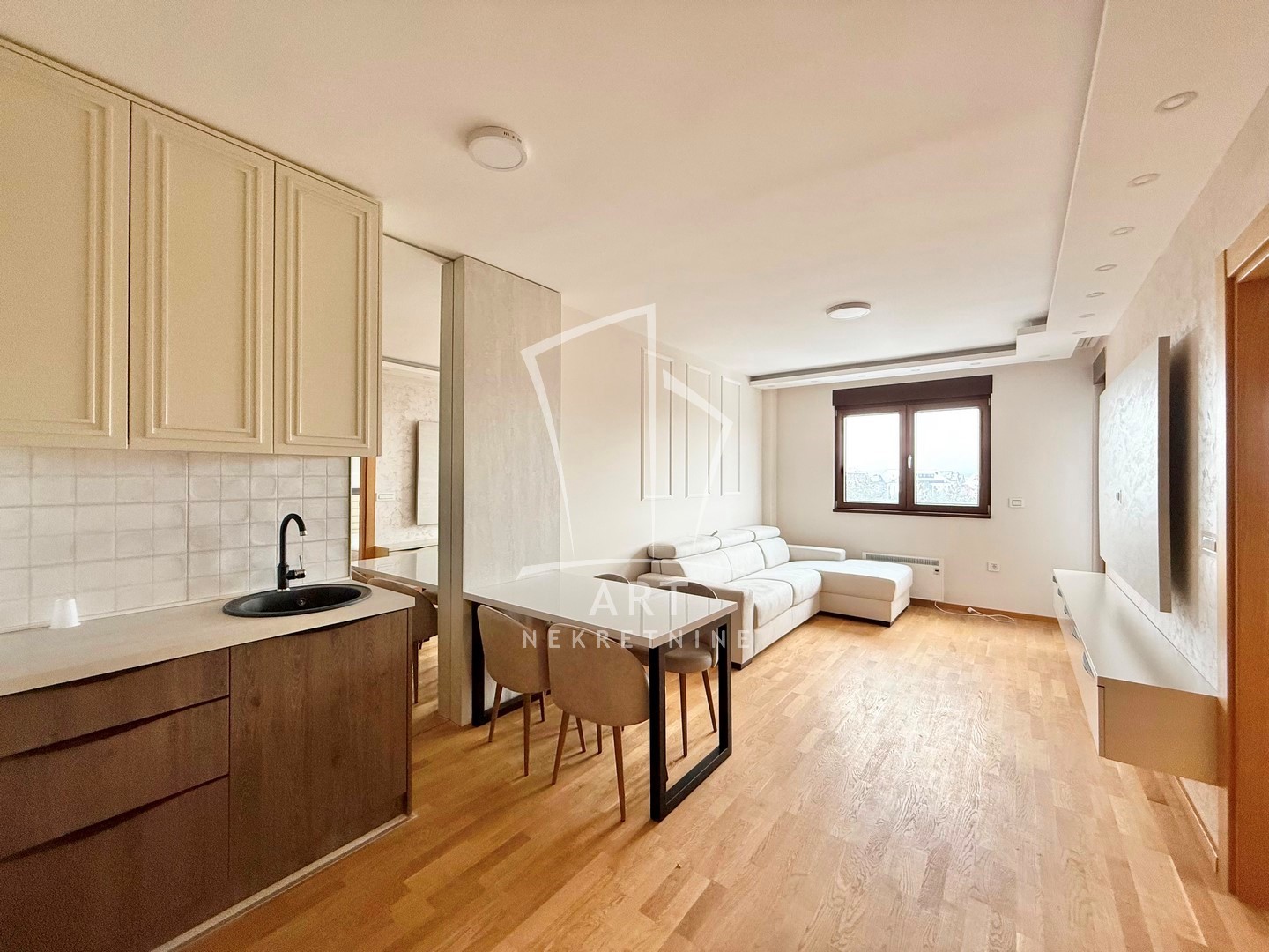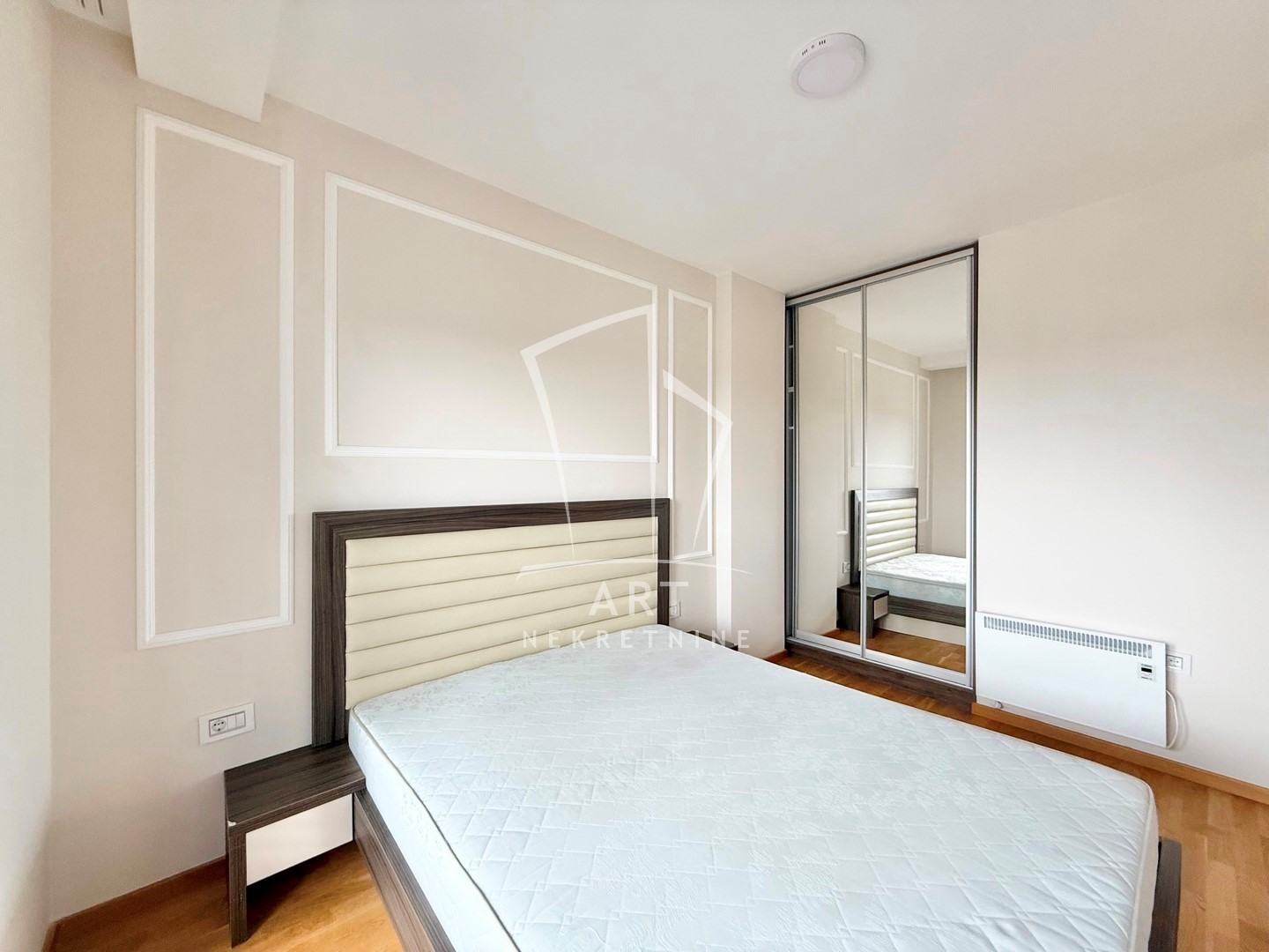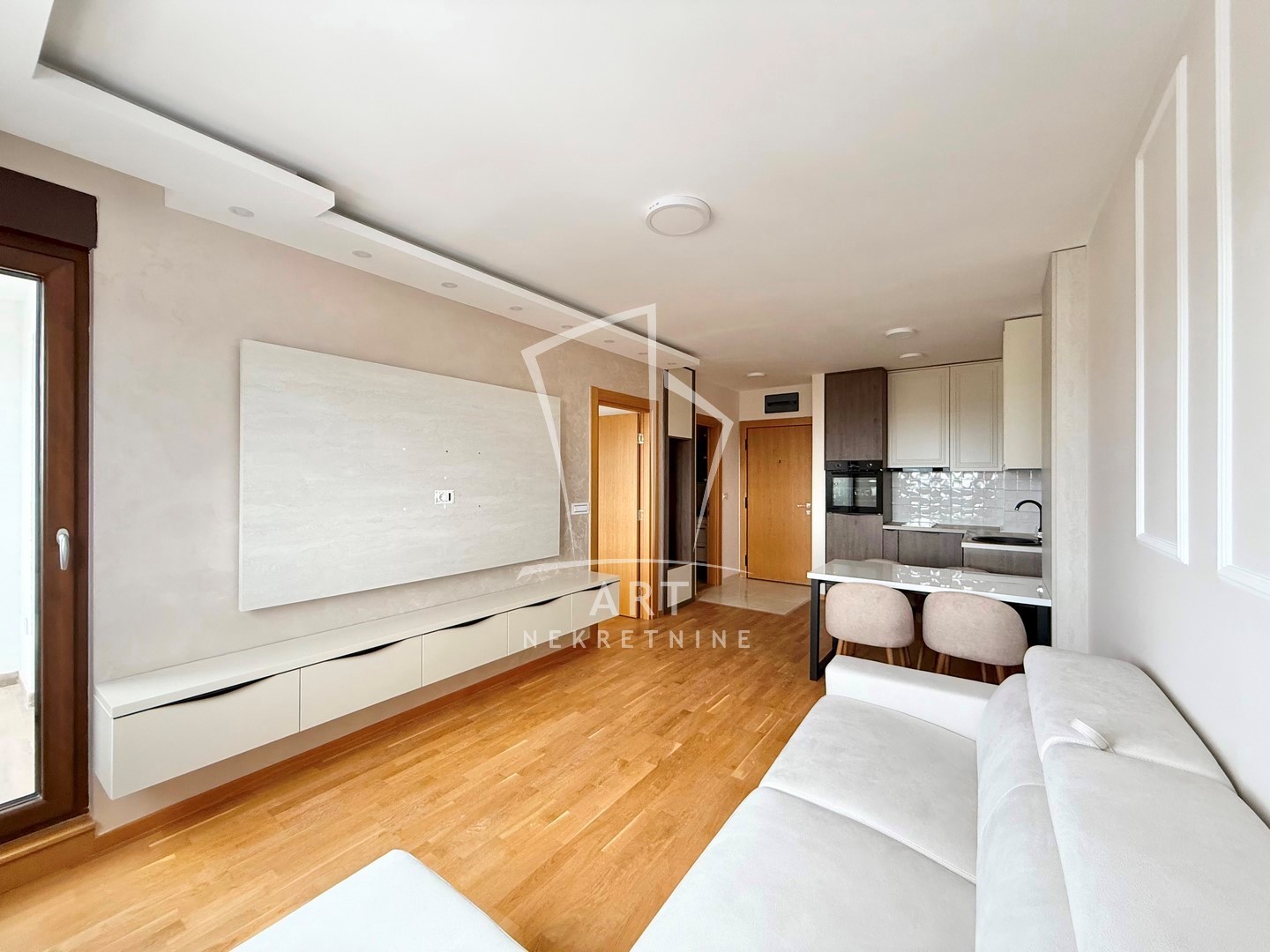 Nalazi se na četvrtom spratu i sastoji se od predsoblja, dnevnog boravka sa kuhinjom i trpezarijom, spavaće sobe, kupatila i terase. Grejanje je na norveške radijatore. Jugozapadno je orijentisan, što mu obezbeđuje obilje prirodnog svetla i prijatnu atmosferu. Stan je opremljen sa novim nameštajem.